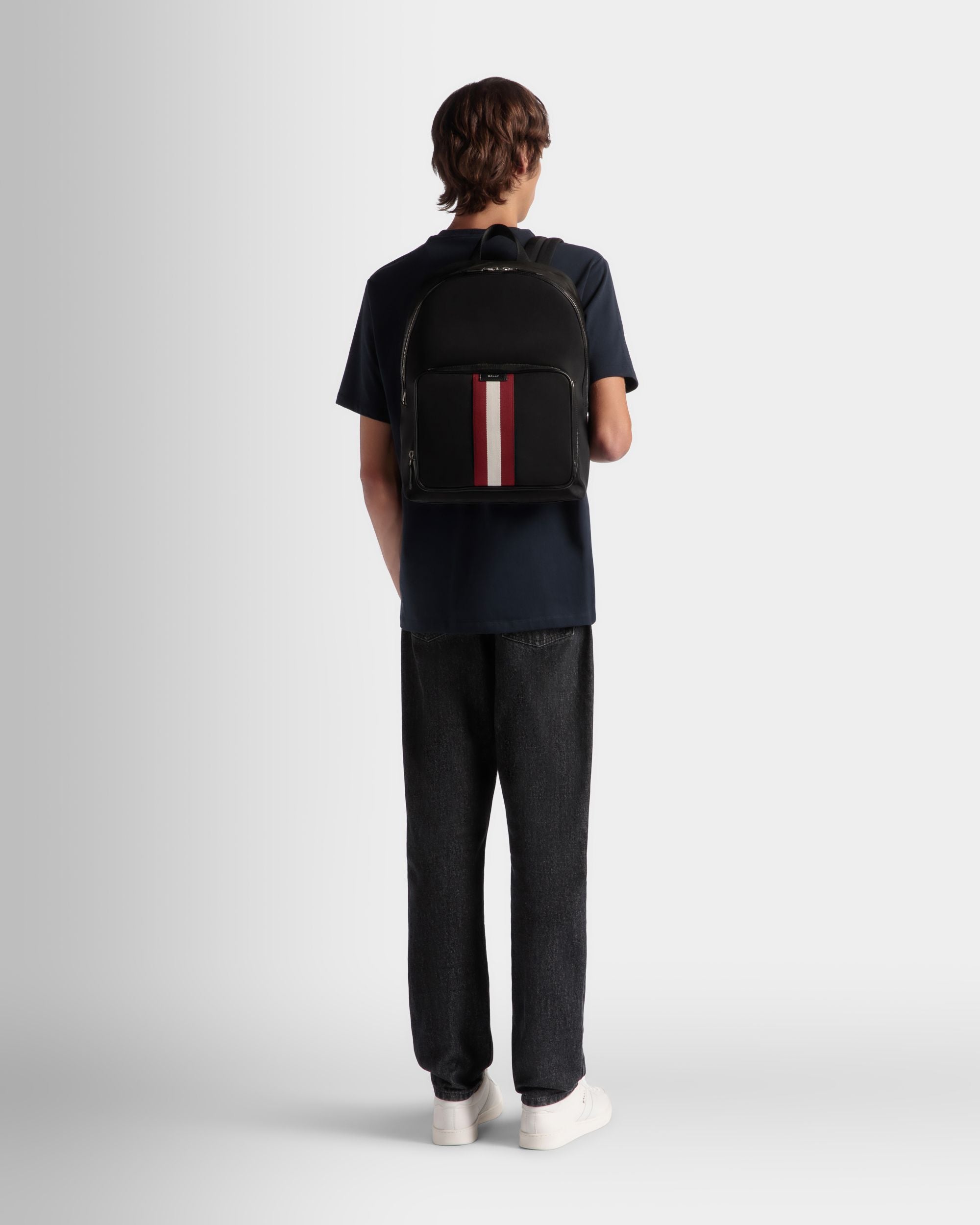 This Code backpack is crafted in black nylon with leather trim. A front outer pocket and a suitcase sleeve at the back make it an ideal travel accessory. A Bally Ribbon decorates the front.