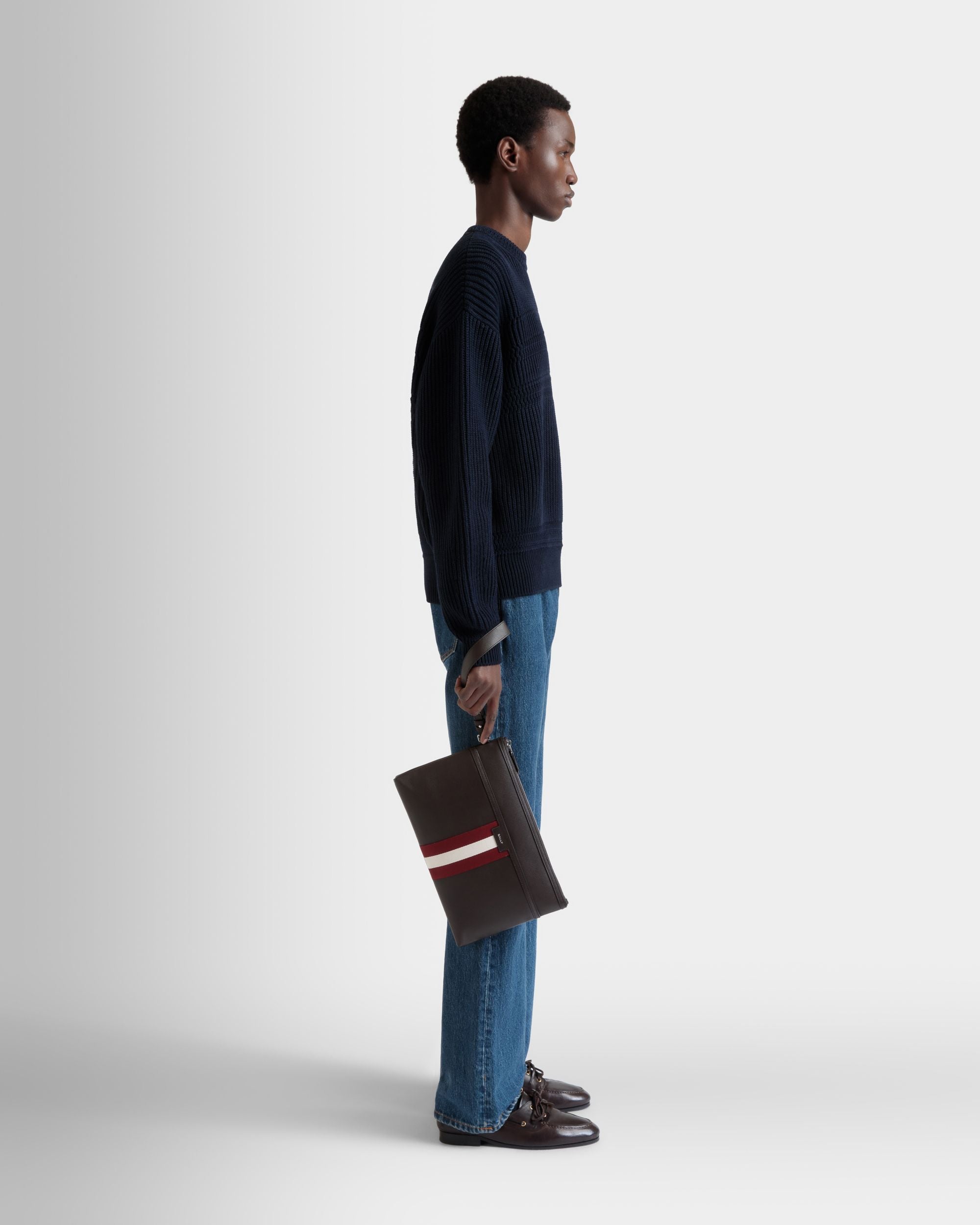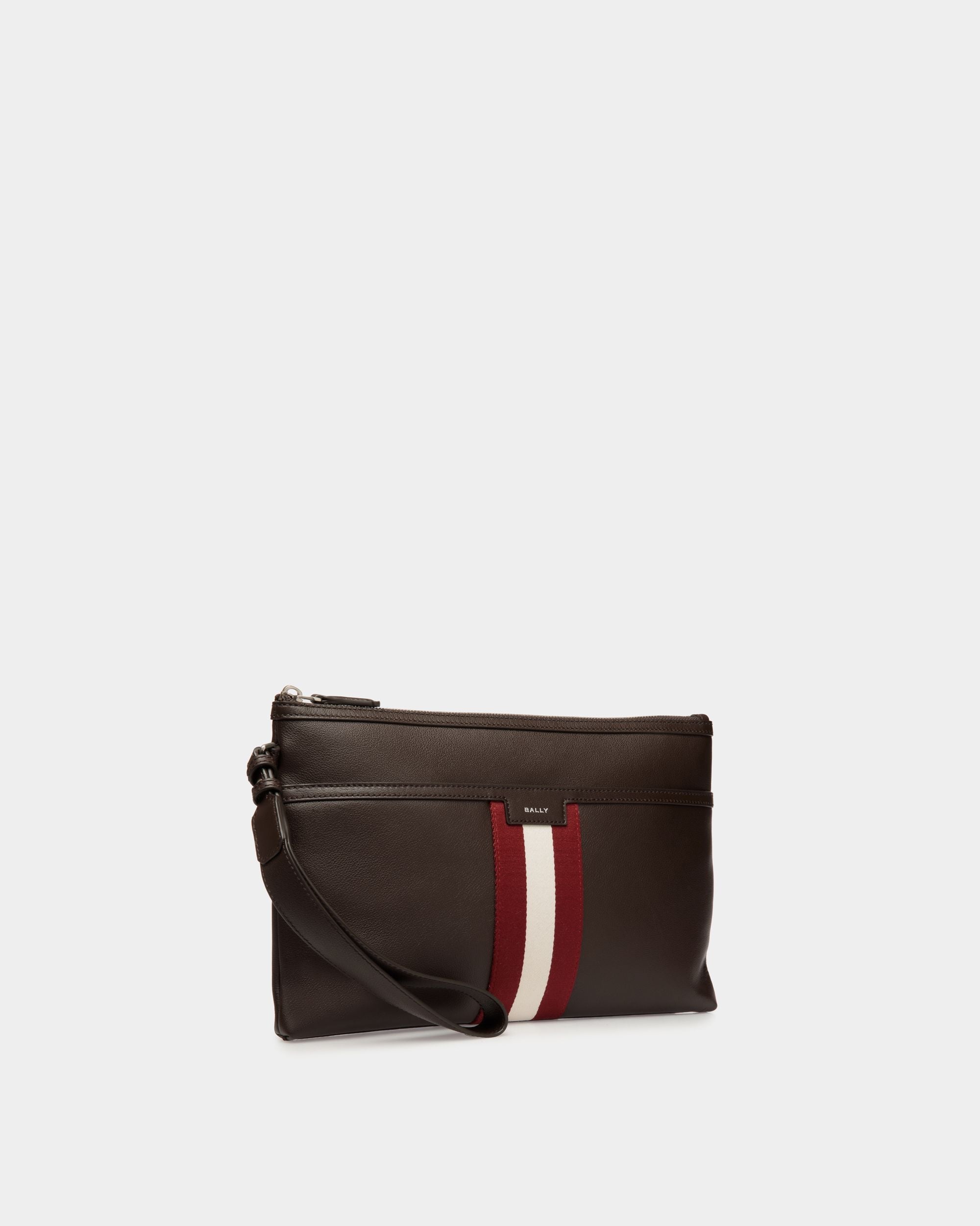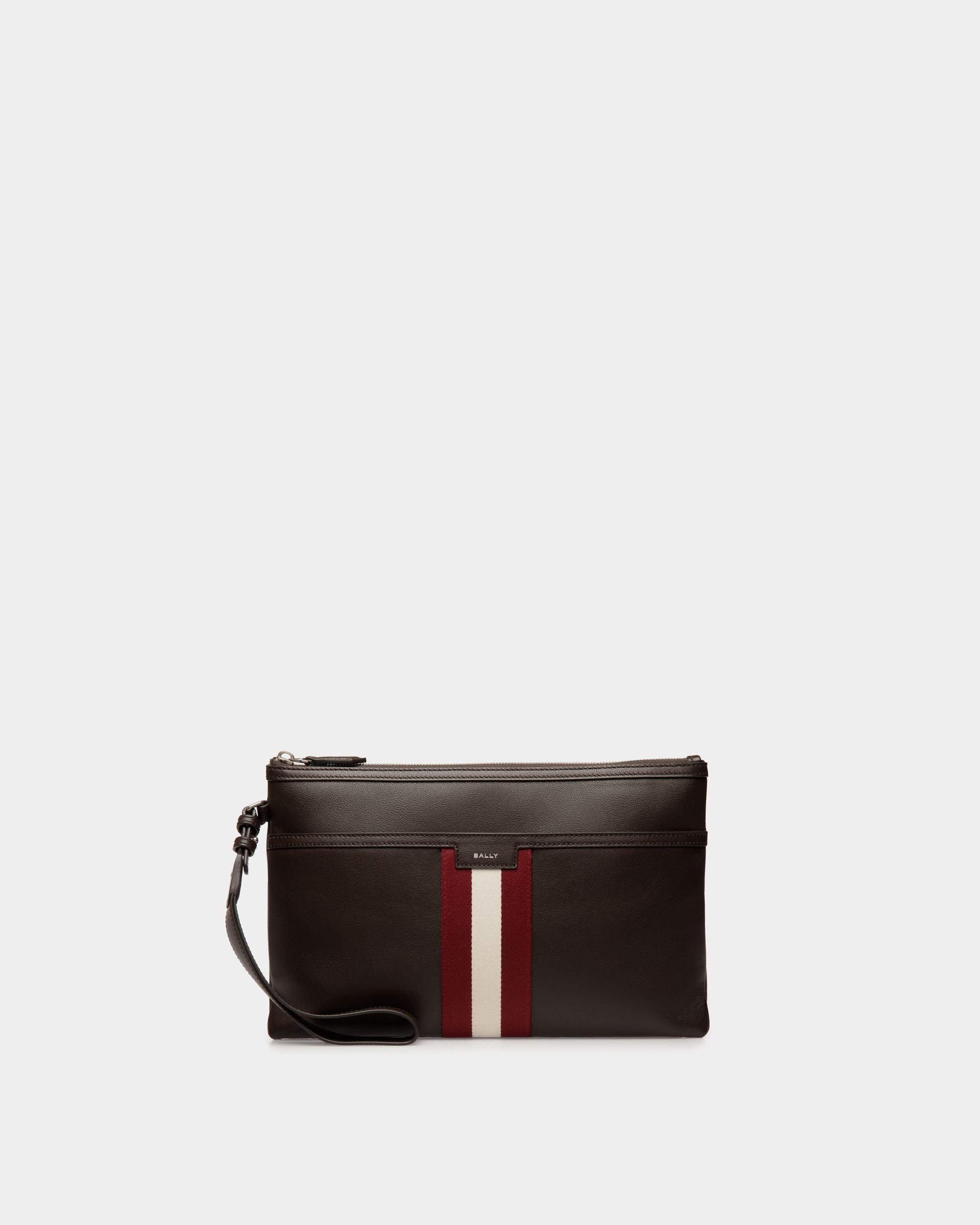 The Code pouch is crafted from soft Ebano-hue leather with a red and white Bally Ribbon to the front. The leather wrist loop offers a choice of hand or wrist carry.
