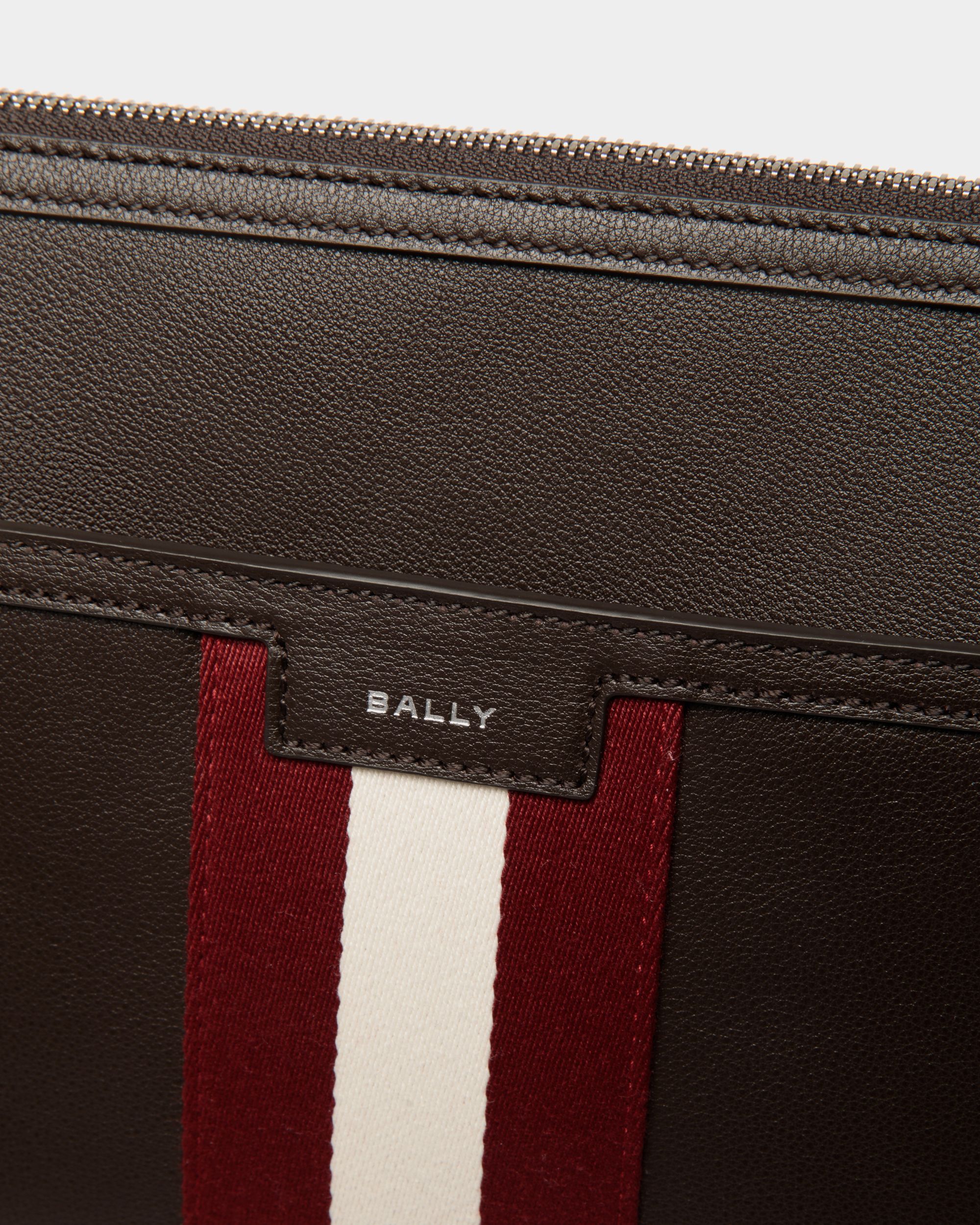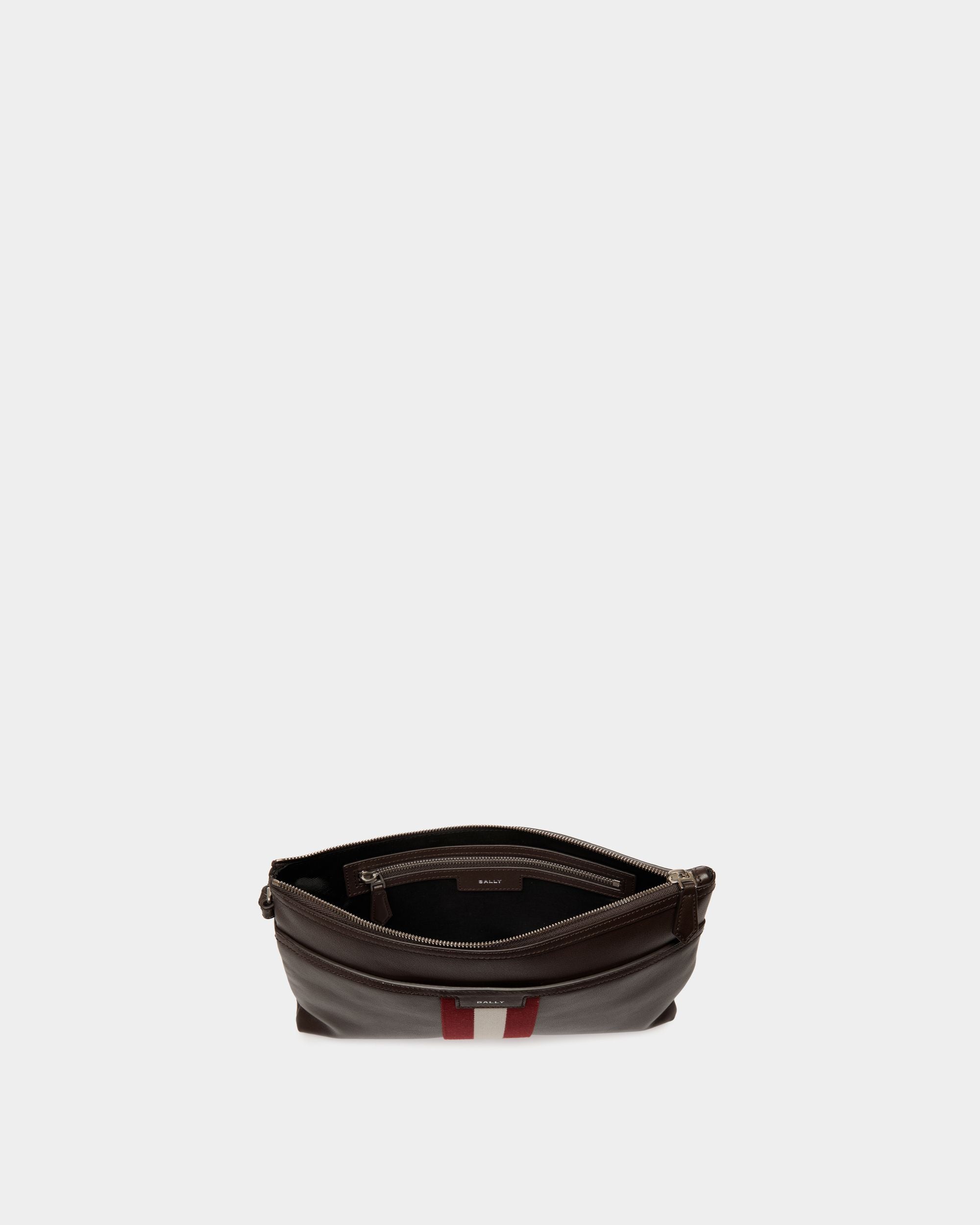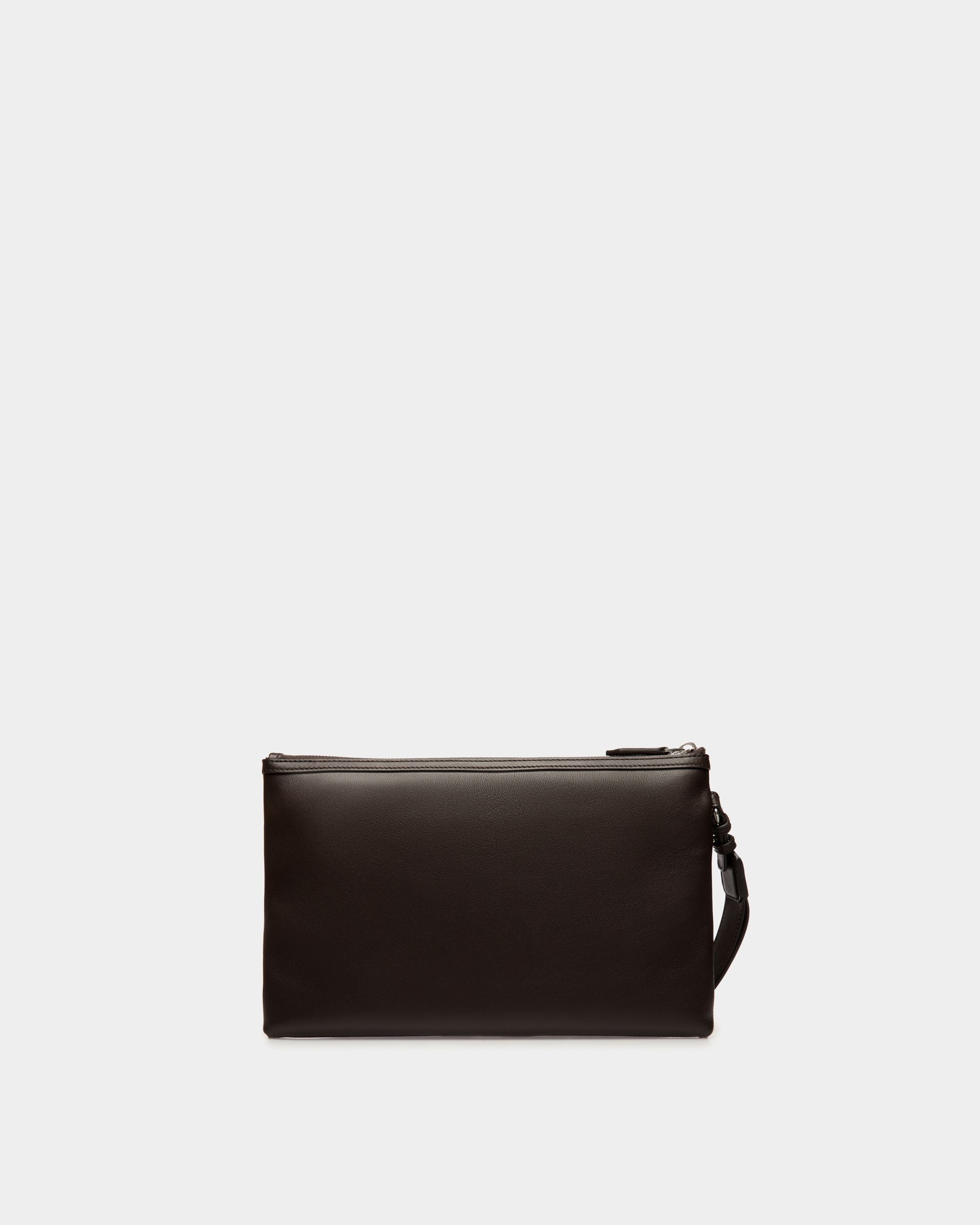 The Code pouch is crafted from soft Ebano-hue leather with a red and white Bally Ribbon to the front. The leather wrist loop offers a choice of hand or wrist carry.