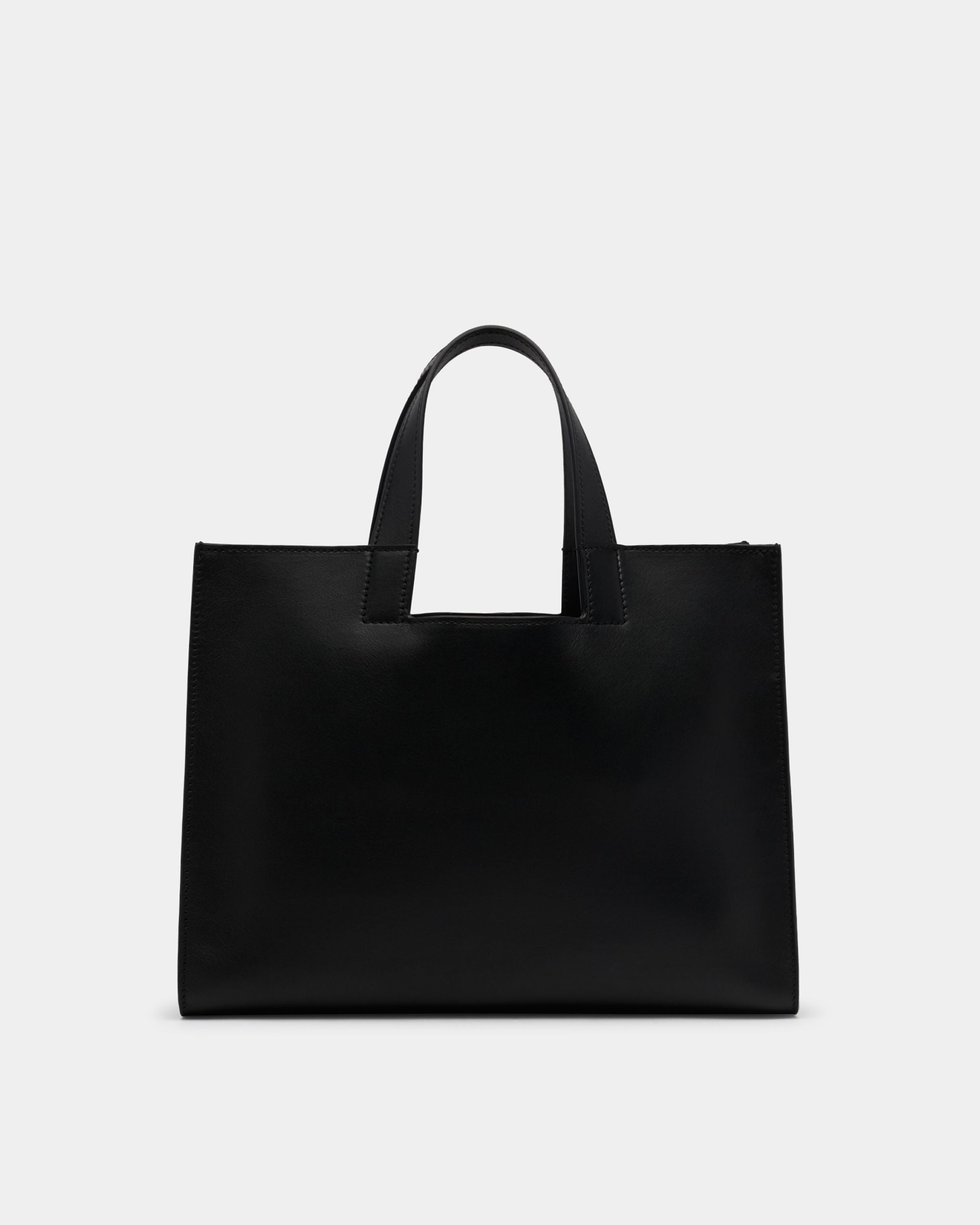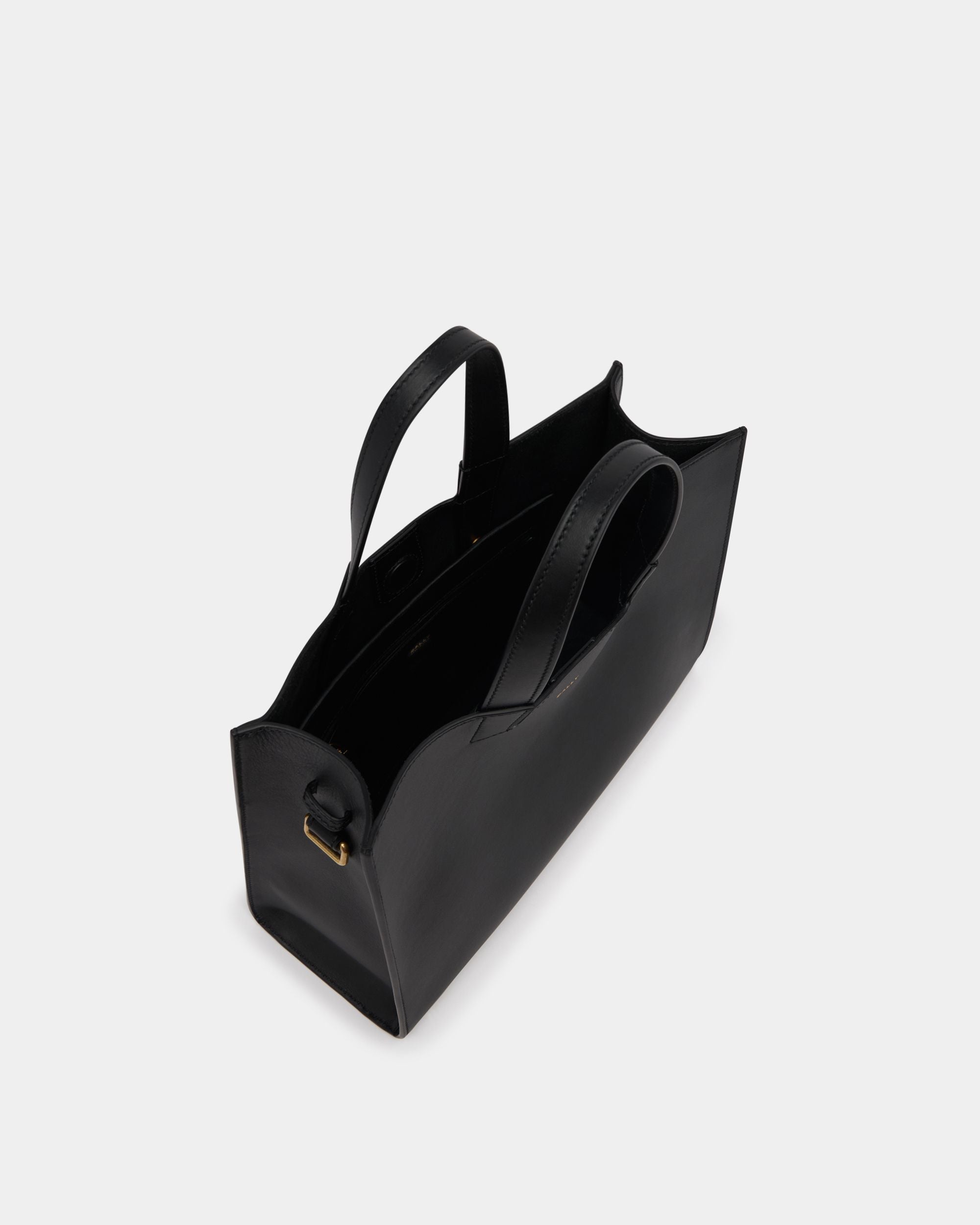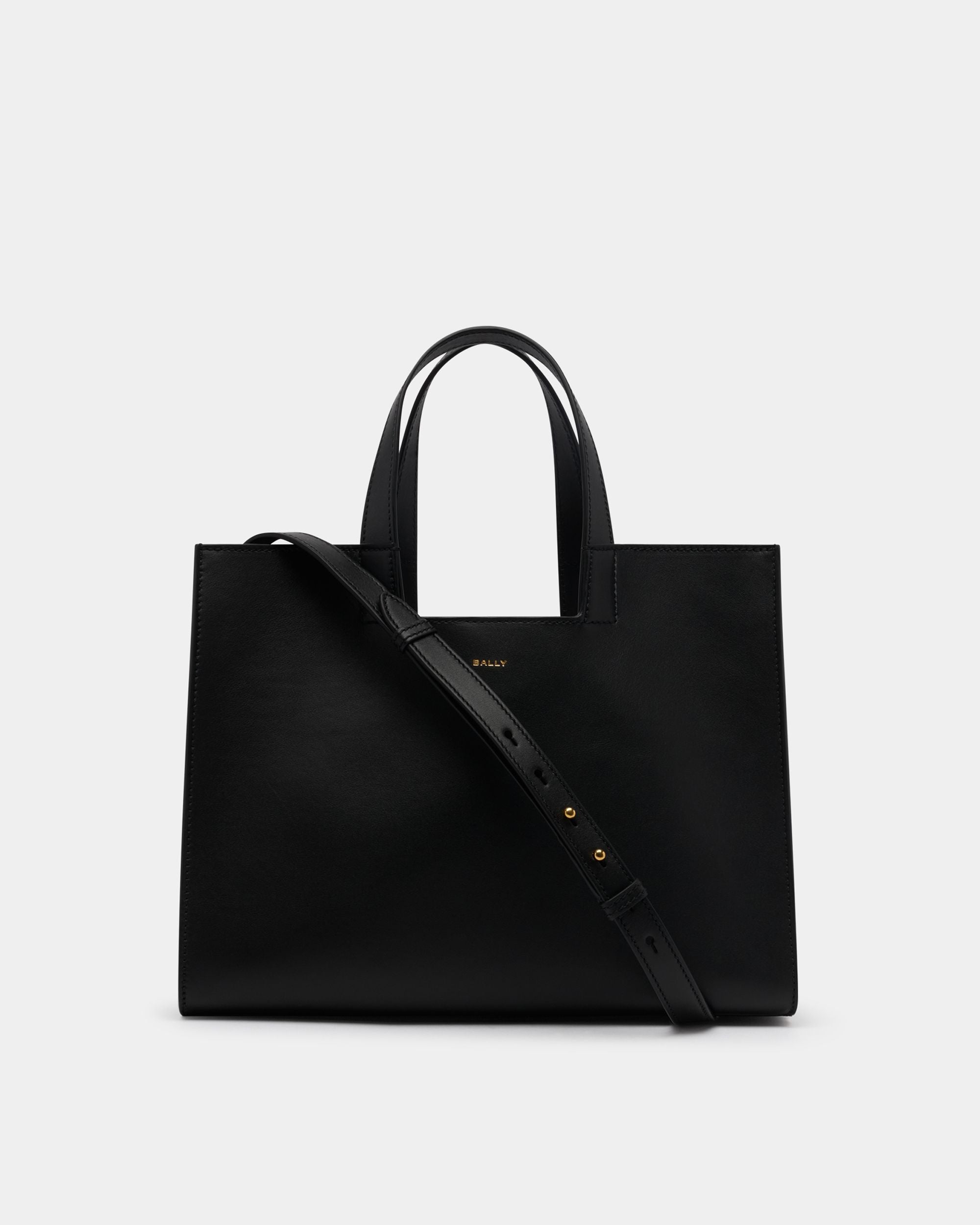 The versatile square silhouette of this Easy Bally tote bag is crafted from soft, supple black calfskin. The included leather pouch ensures its practicality. A detachable shoulder strap adds a range of portability options in addition to the two top handles.