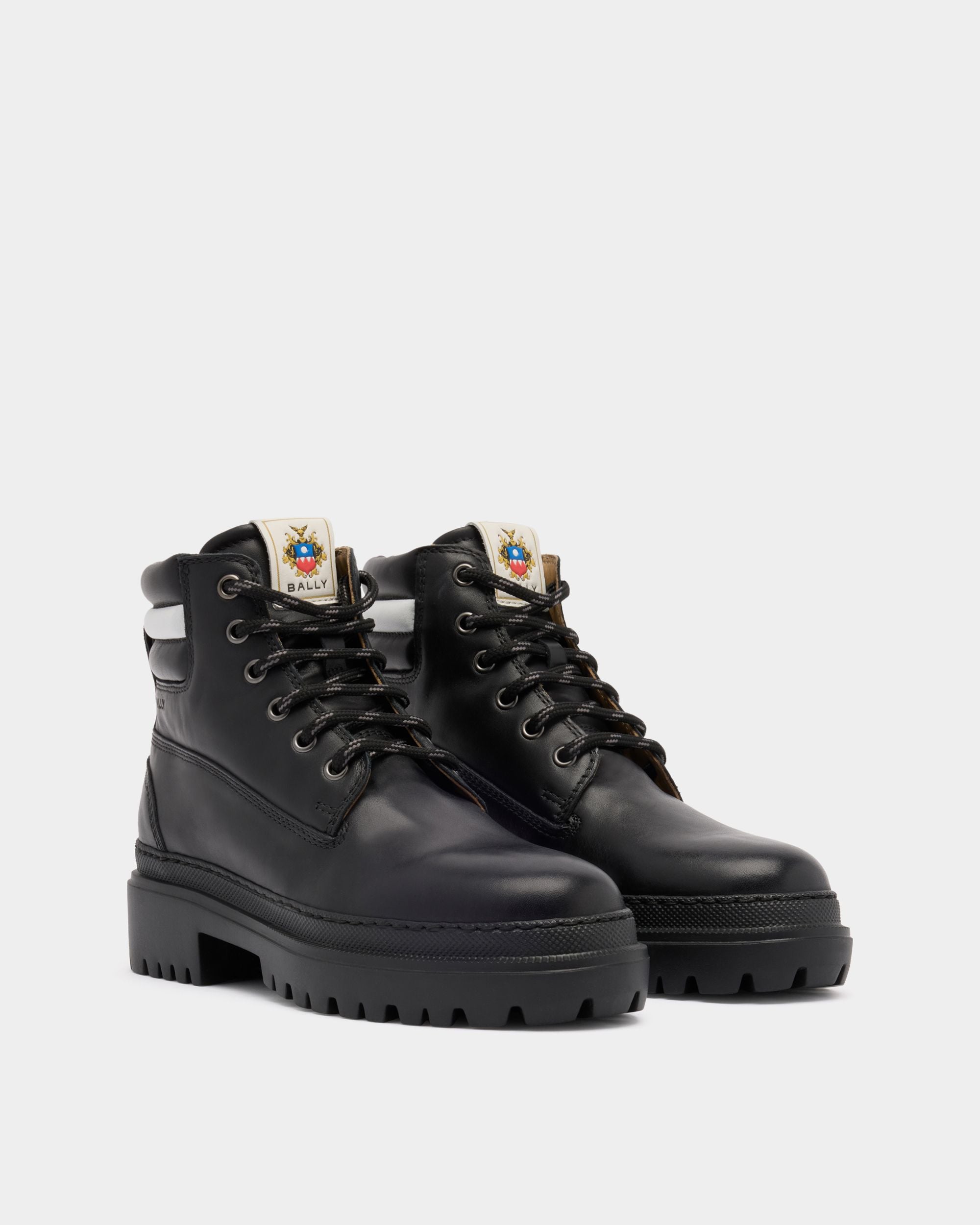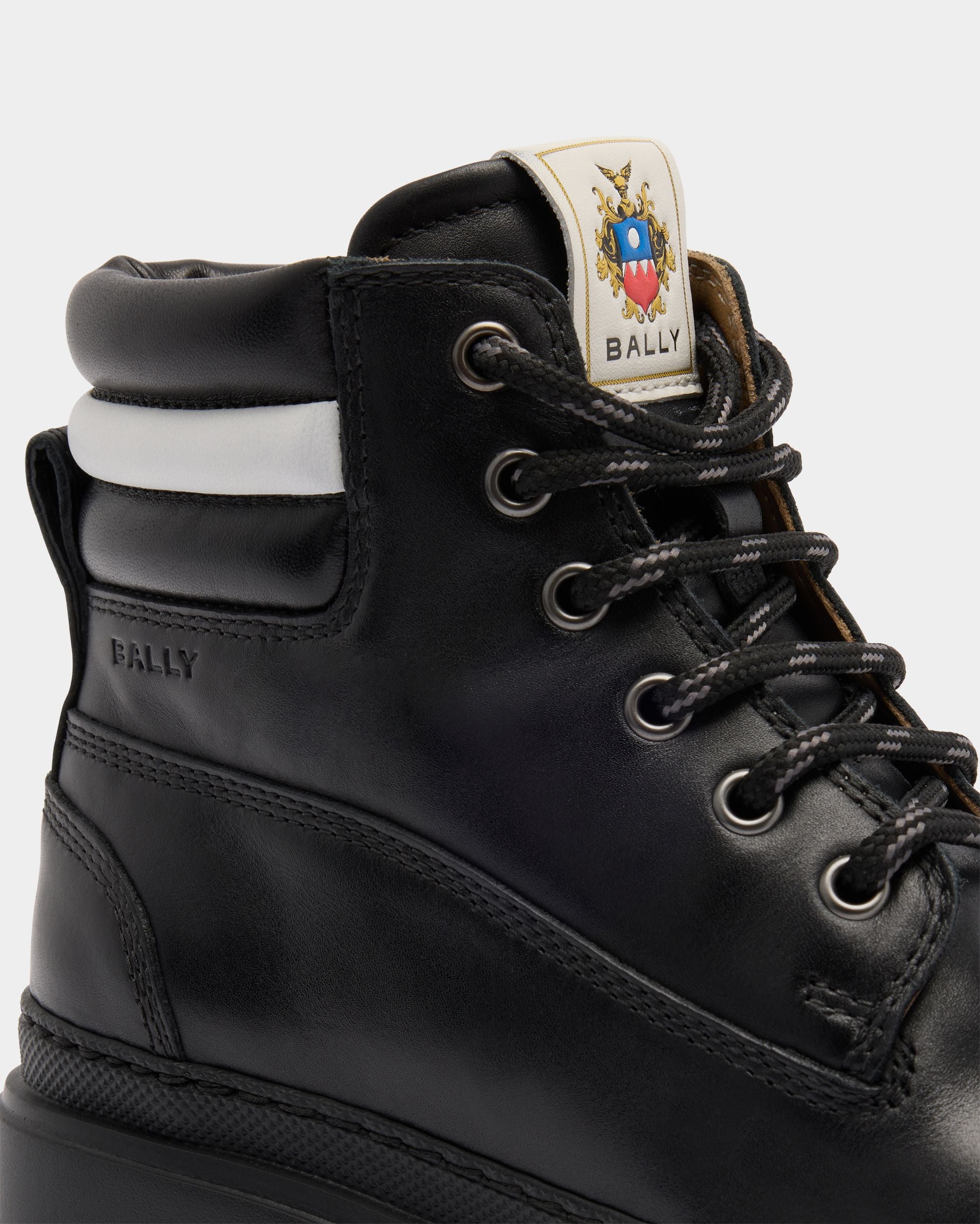 This Hallen boot in black calfskin is a versatile, wear-anywhere style. A rubber tank sole provides grip on all terrain as well as a contemporary silhouette. A Bally Ribbon in black and white pads the collar along the top.