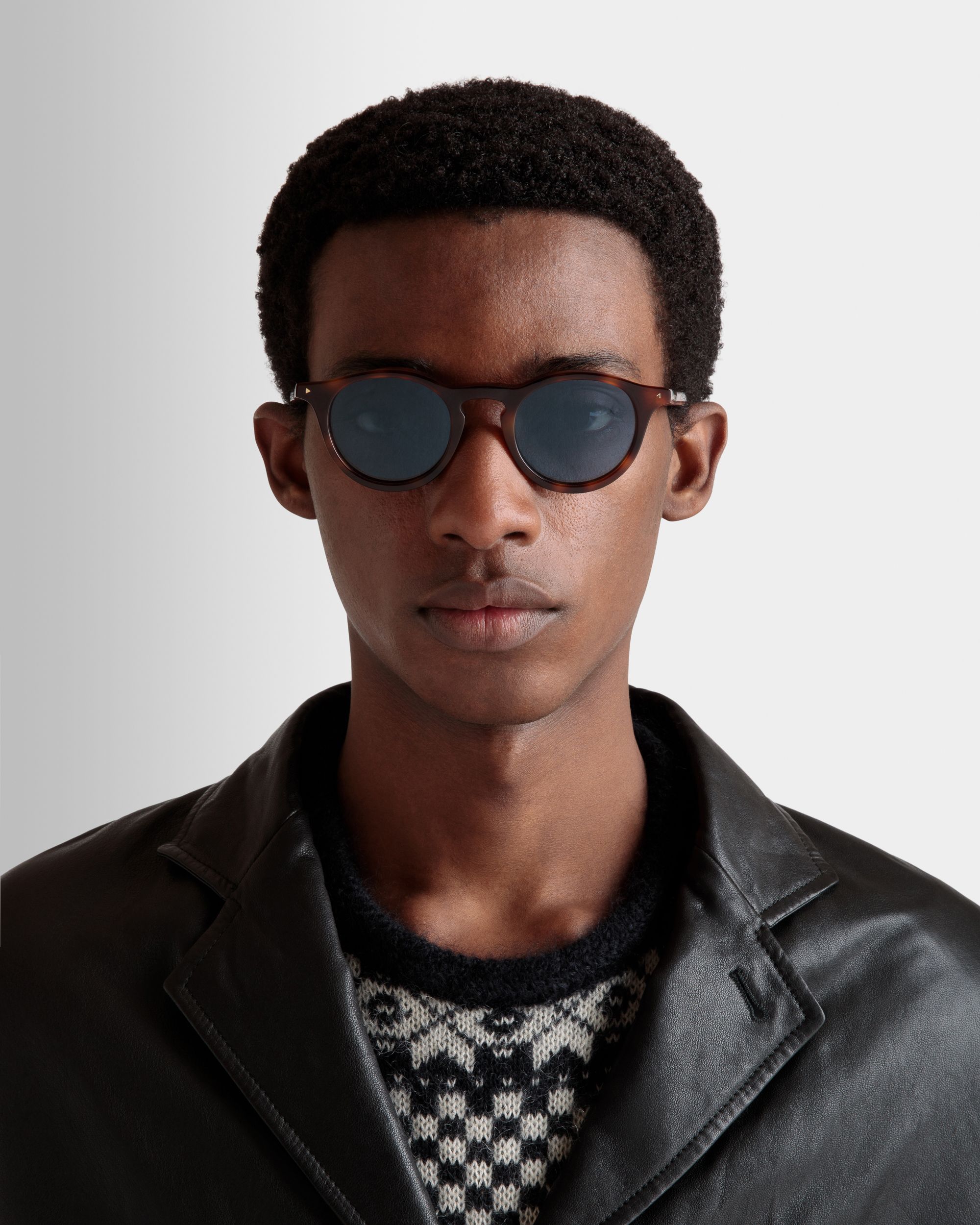 Effortlessly cool, the curvilinear essence of a classic Pantos frame is complemented by additional volume and depth around the lenses of the Hermann sunglasses. They're seen here in Havana acetate with glass lenses, a hallmark of premium quality eyewear.