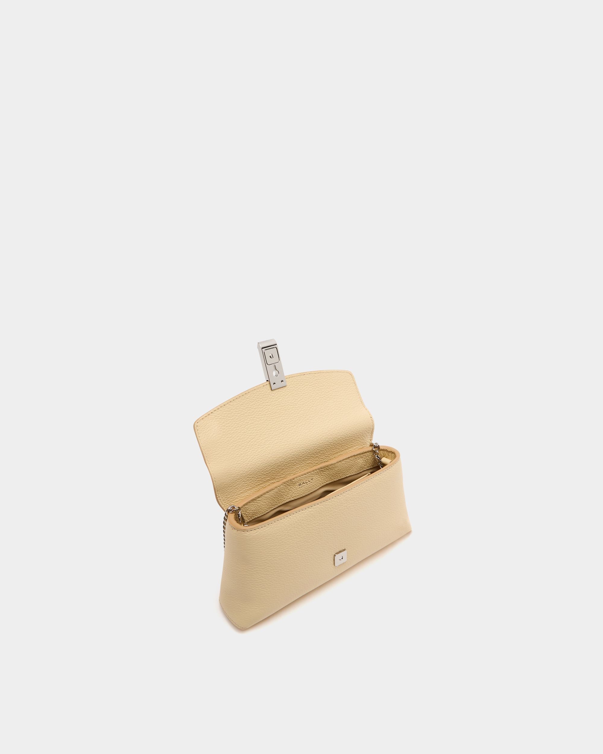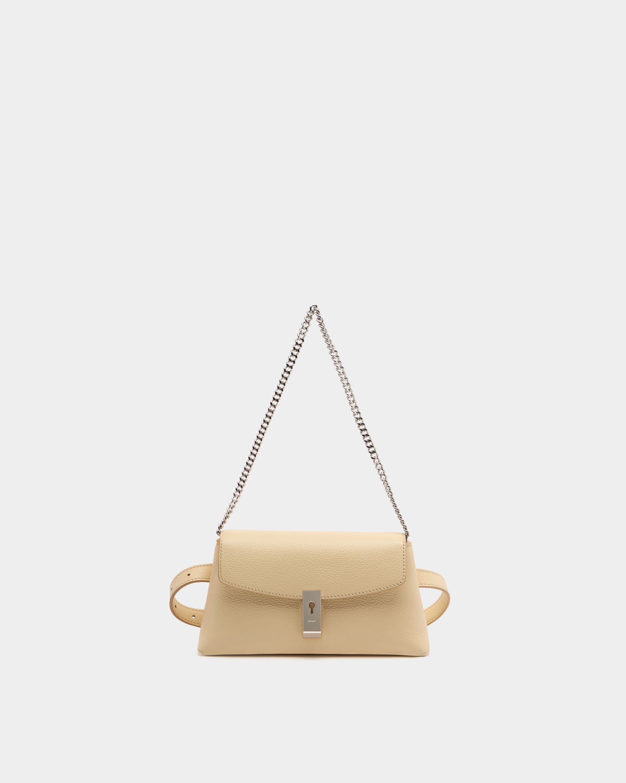 Soft, delicately grained Ginger calfskin revisits the structured, geometric silhouette of this feminine mini bag. The Lock Me hardware on the flap closure is in the same palladium-hue metal as the detachable chain strap. An optional leather belt strap further increases its versatility.