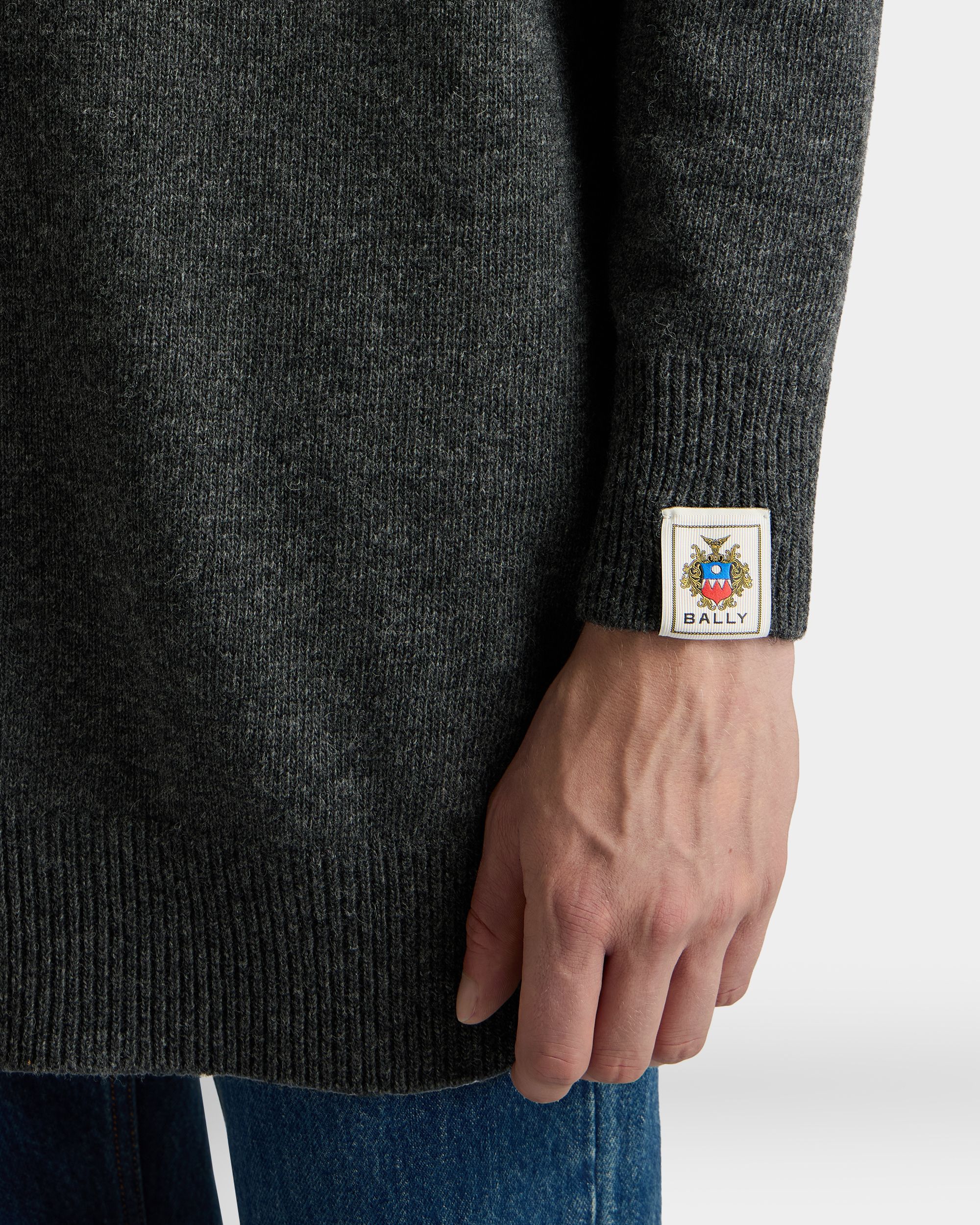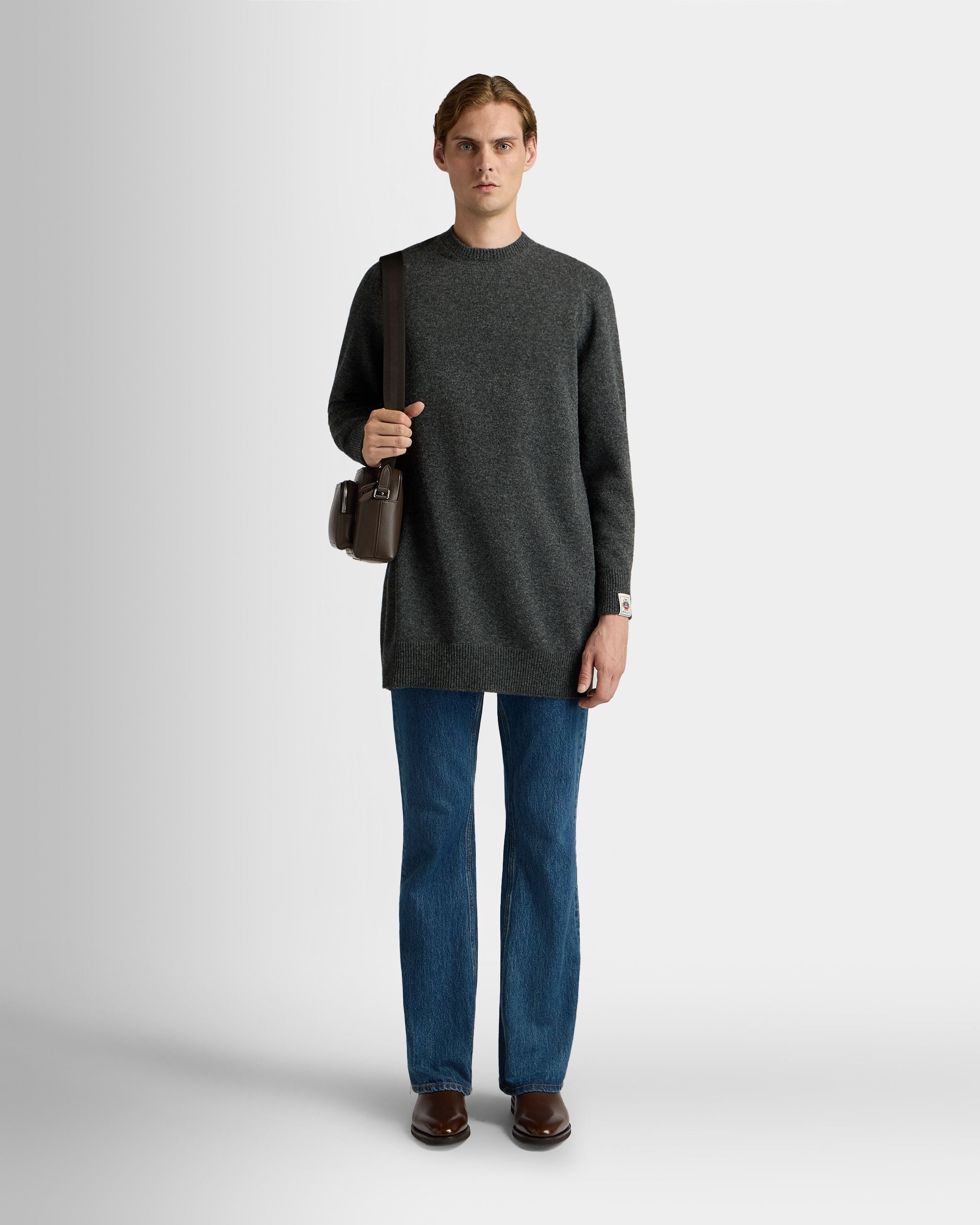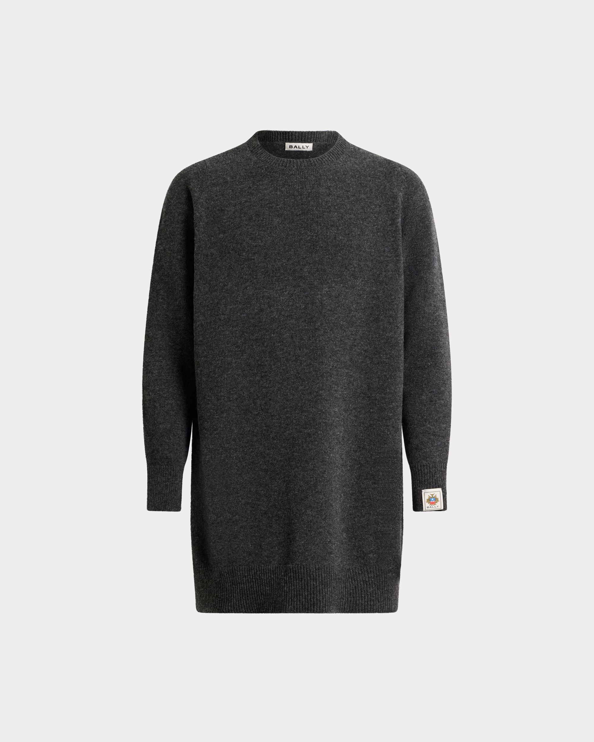 Long sweater in dark grey wool with a slightly raised crew neckline and ribbing on the collar, cuffs and hem. A Bally Crest label decorates the left cuff.