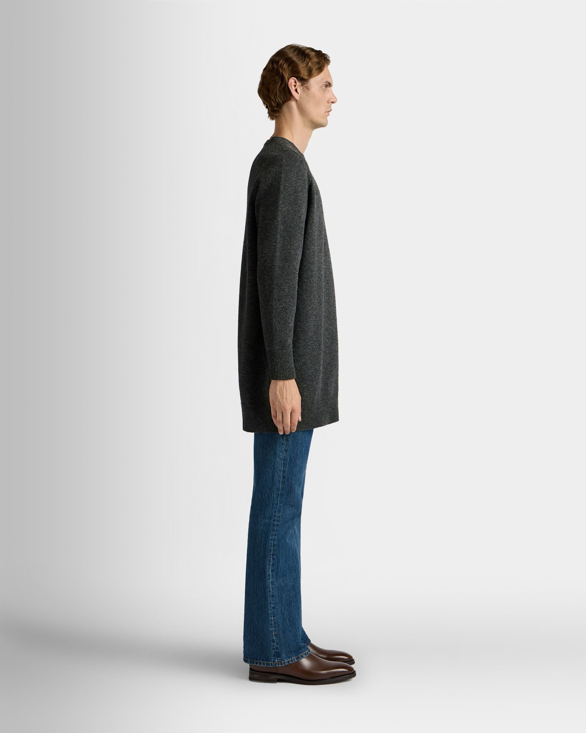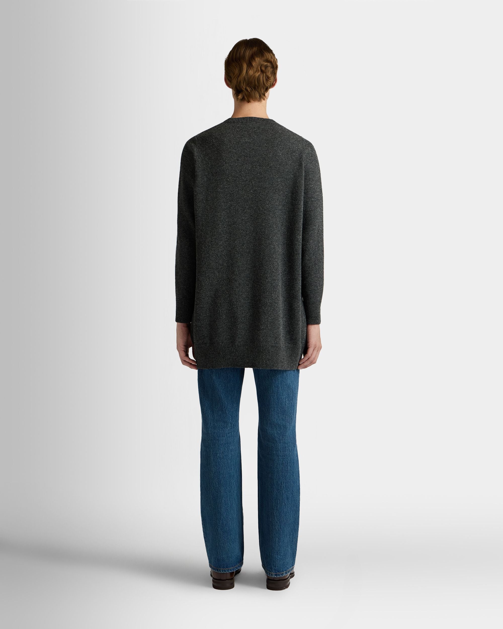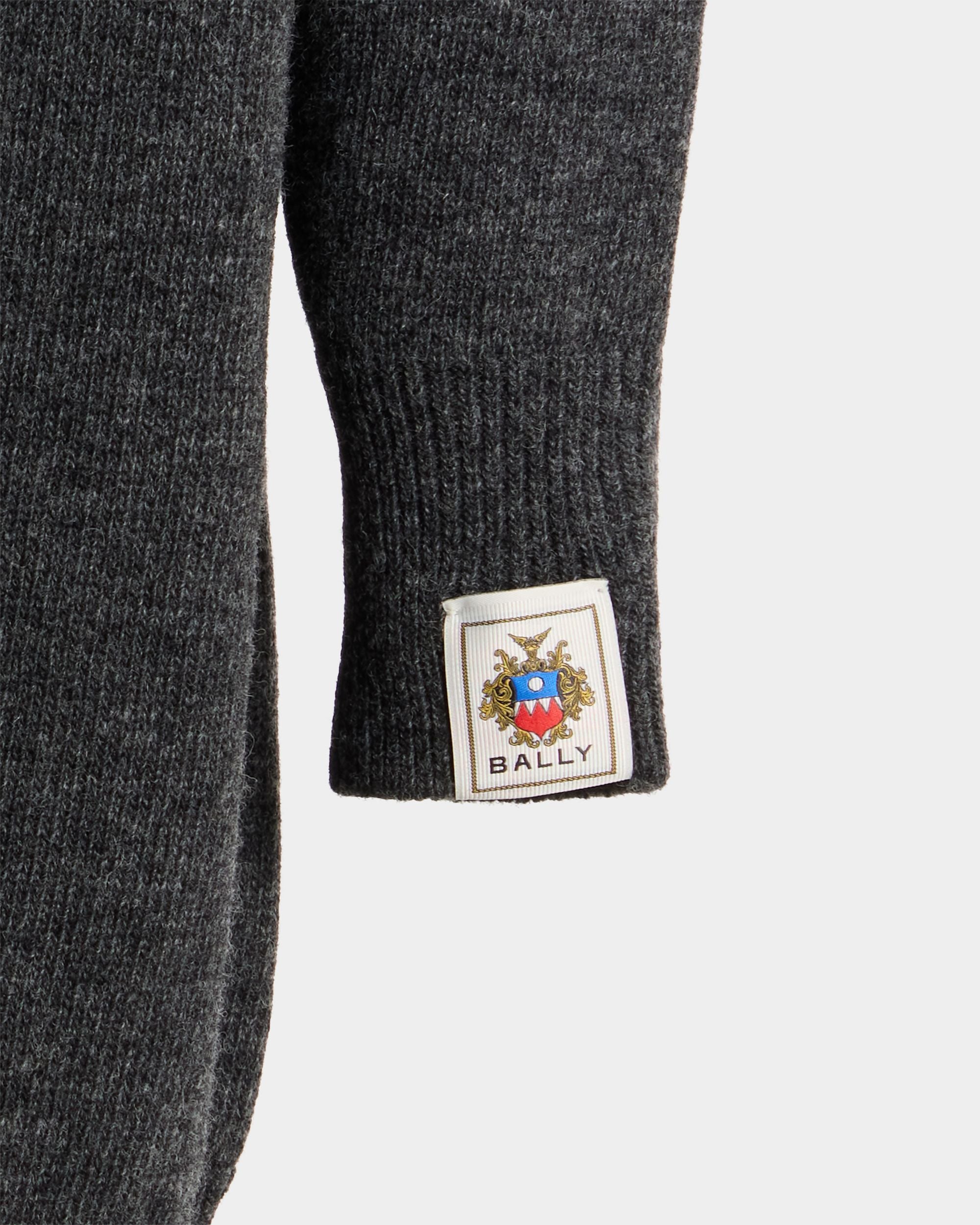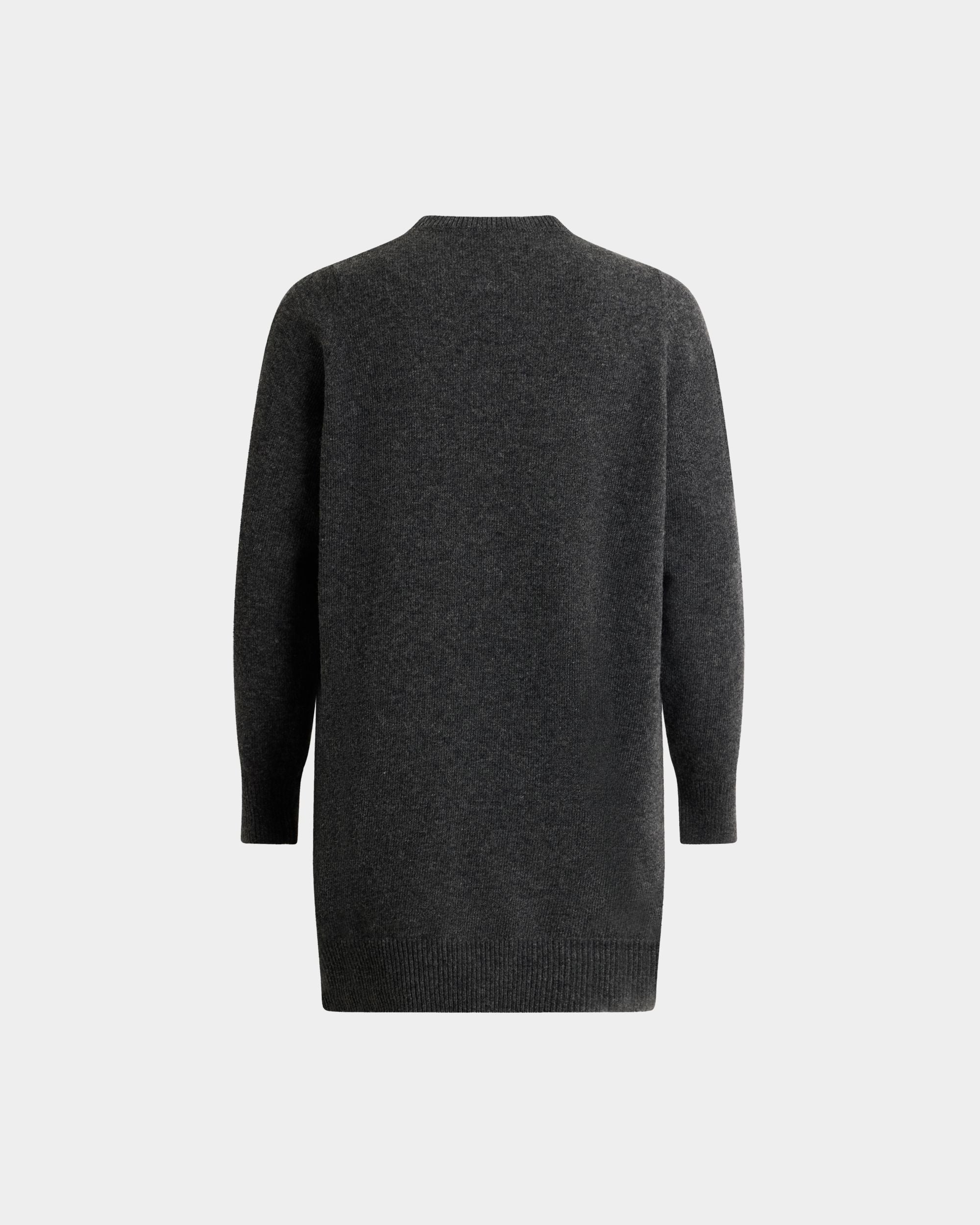 Long sweater in dark grey wool with a slightly raised crew neckline and ribbing on the collar, cuffs and hem. A Bally Crest label decorates the left cuff.