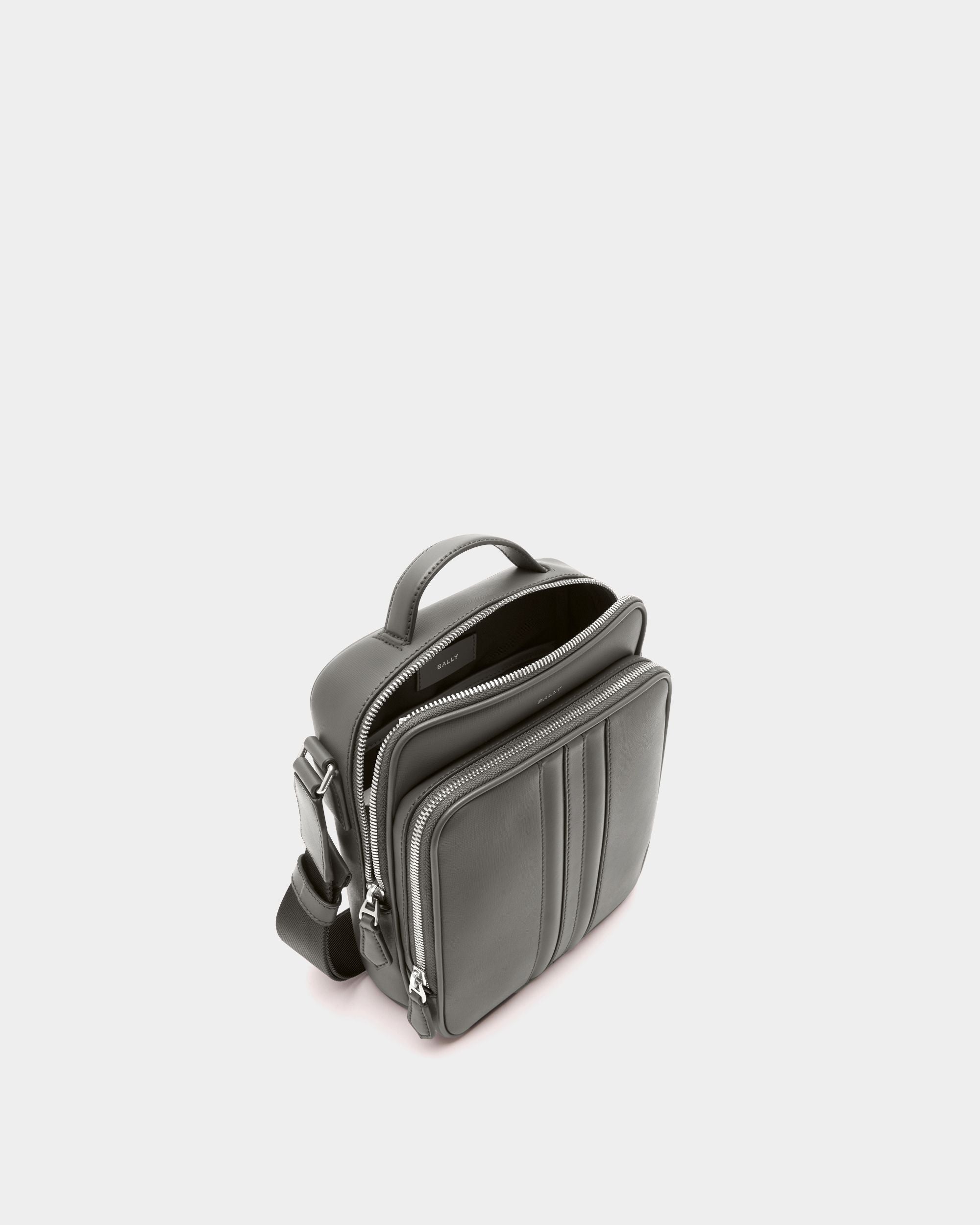 This Mythos crossbody bag in grey recycled leather is embellished by a foil logo and a padded leather Ribbon at the front, crafted via meticulous inlay. The adjustable strap offers a choice between shoulder or crossbody carry.
