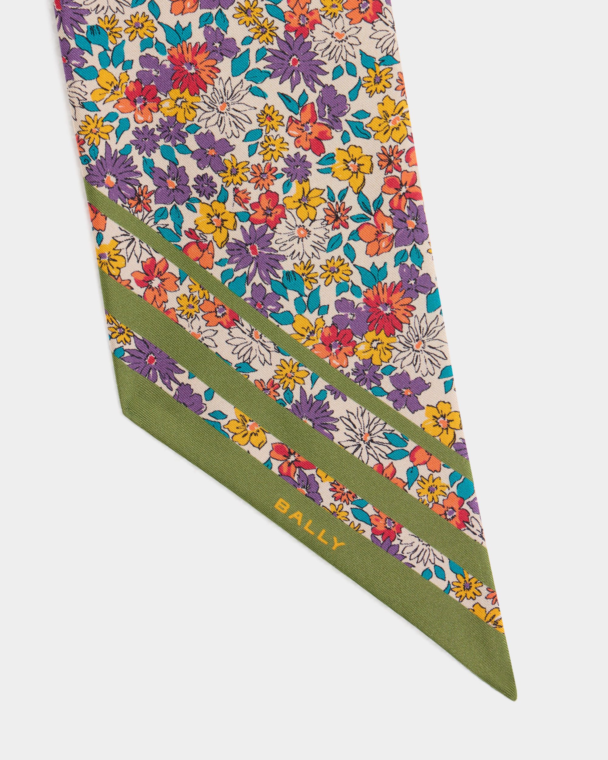 This silk neck bow features a delicate all-over floral print in multiple colors against a beige background. The Bally logo is printed on the short sides.