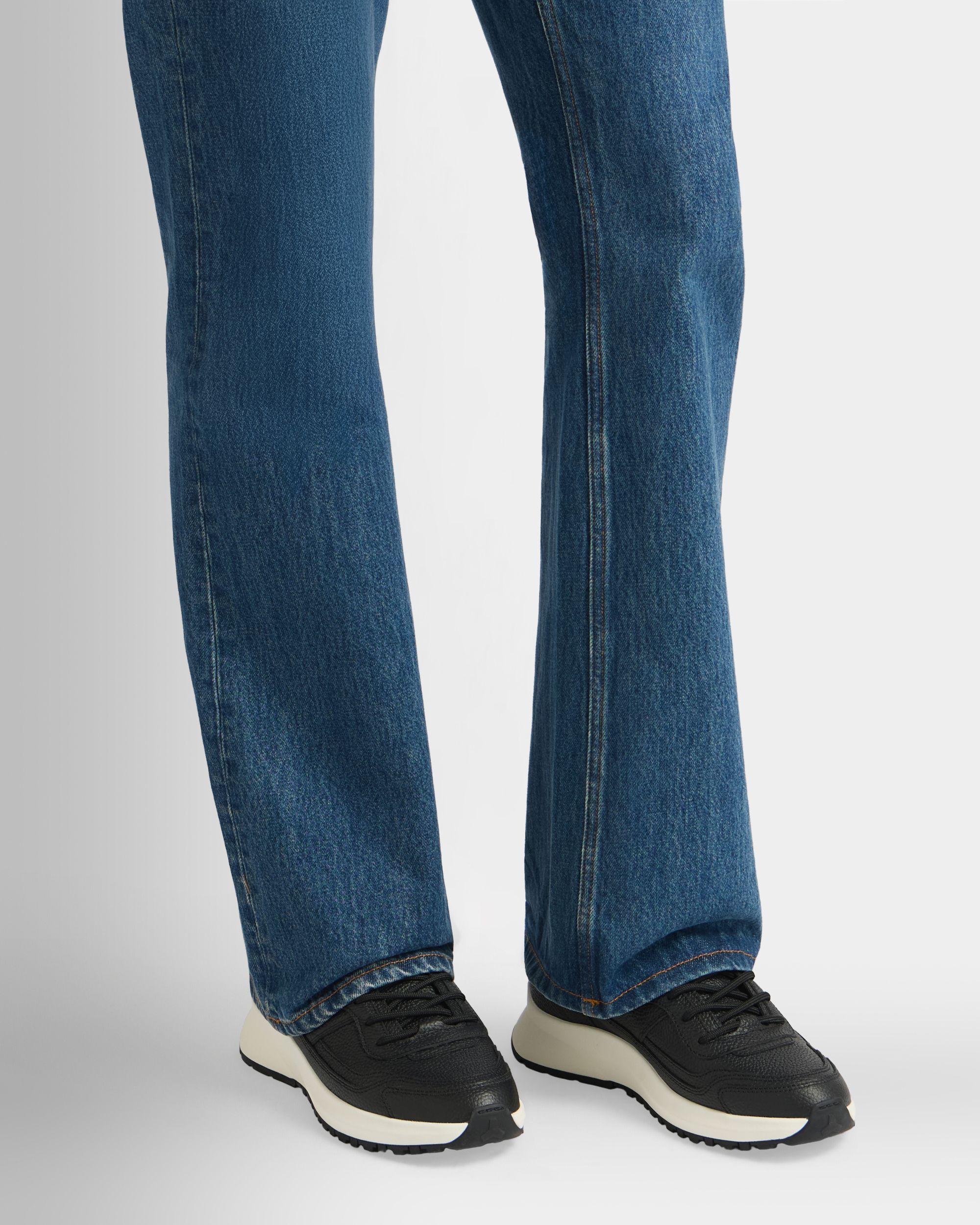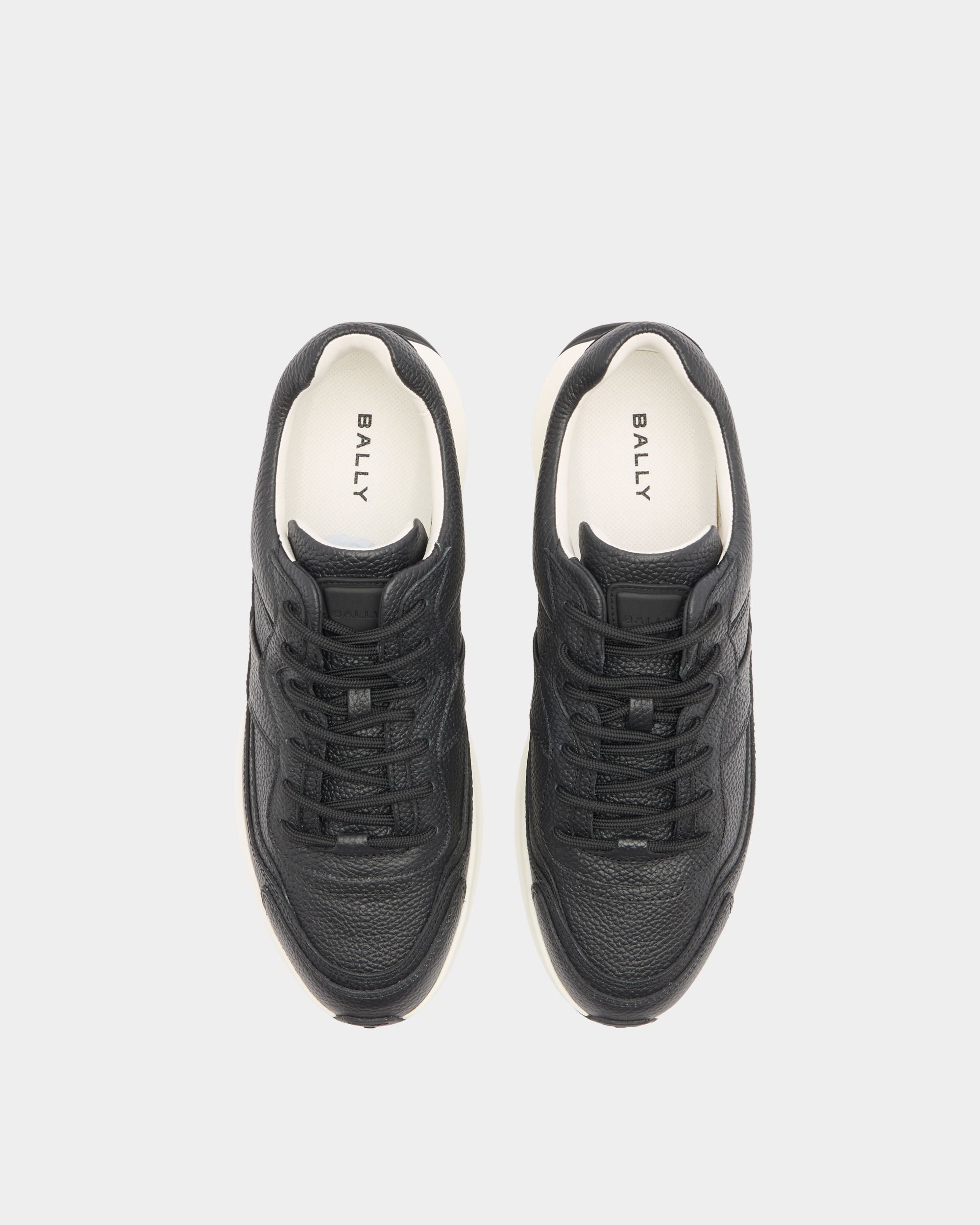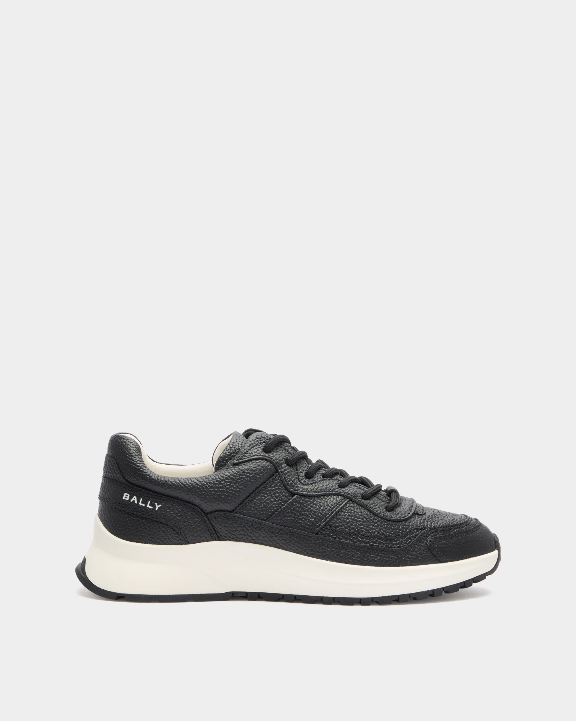 This black leather Outline sneaker is characterized by a grained finish and a chunky yet lightweight running sole for all-terrain grip. The debossed Bally logo on the tongue and the subtle tonal Ribbon motif at the side create an iconic note. Round laces complete the look.
