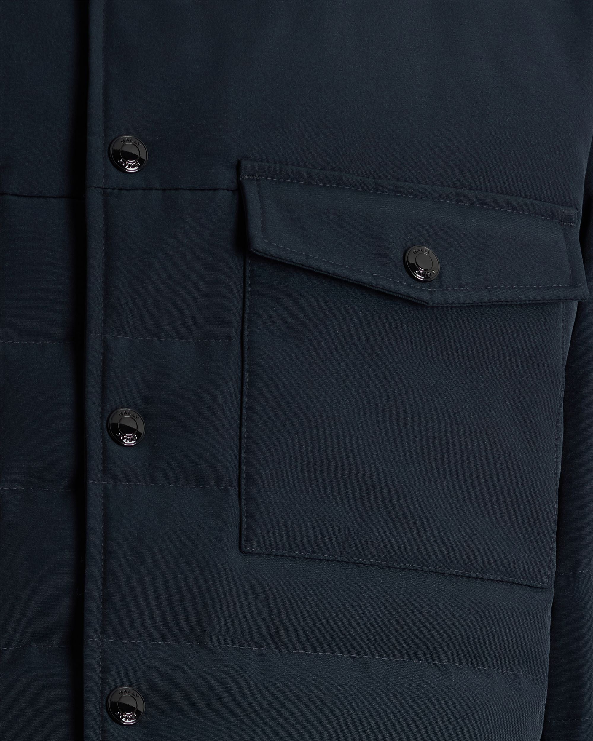 This navy blue quilted overshirt in cotton-polyester fabric features a snap closure, two flap chest pockets and half-welted hip pockets.