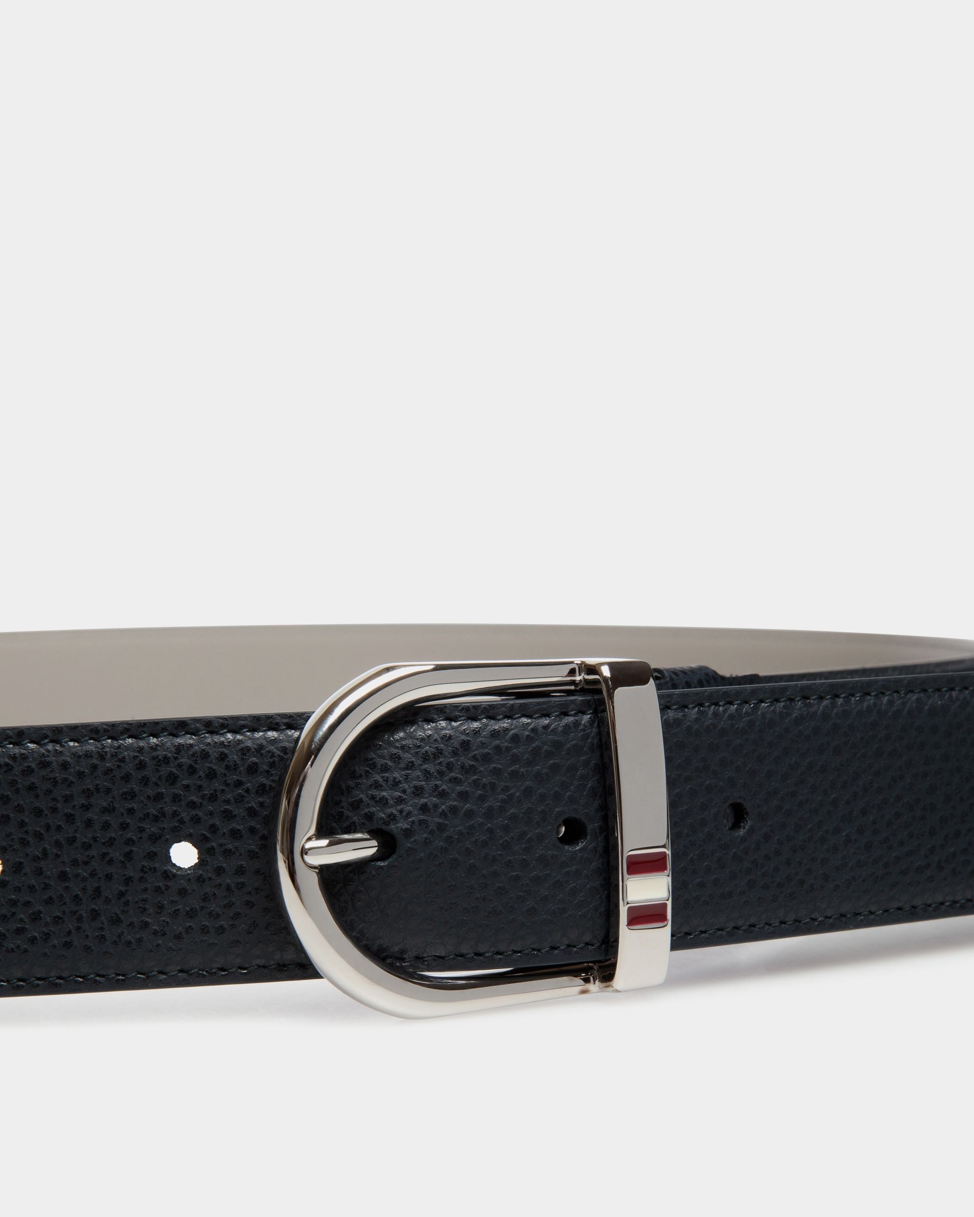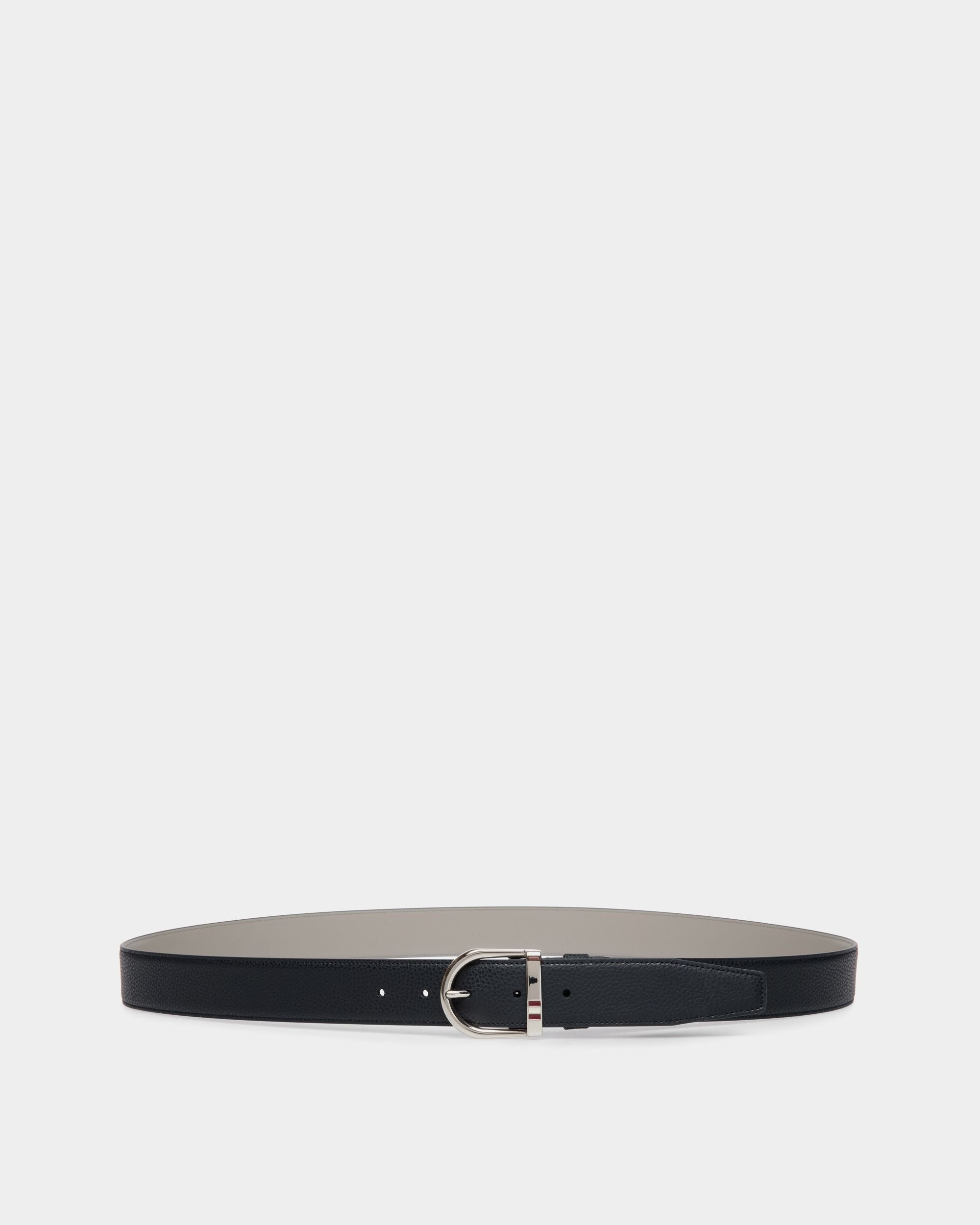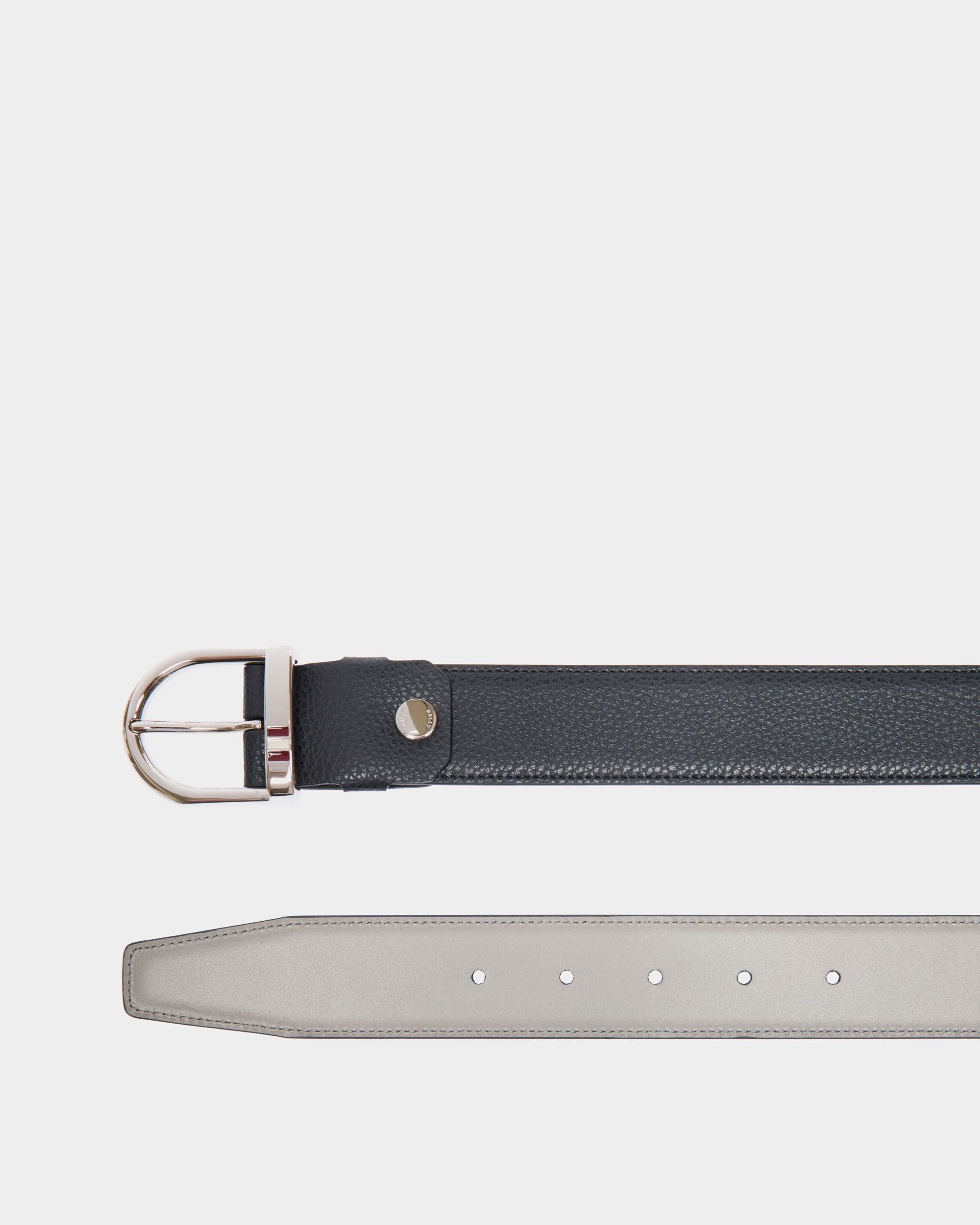 This belt is made from durable grained leather. It fastens with a polished metal buckle detailed with the Bally ribbon.