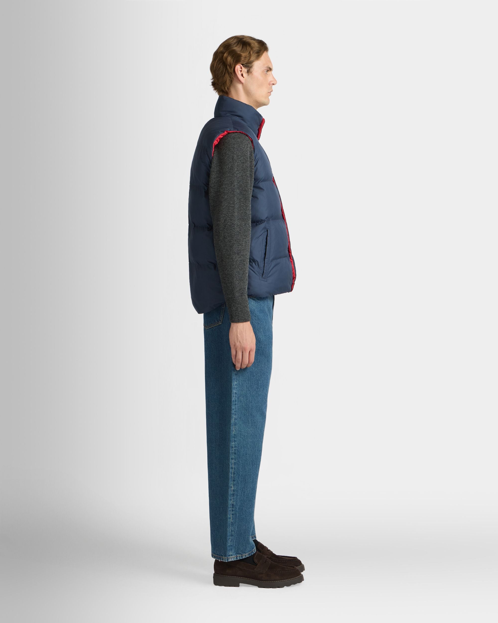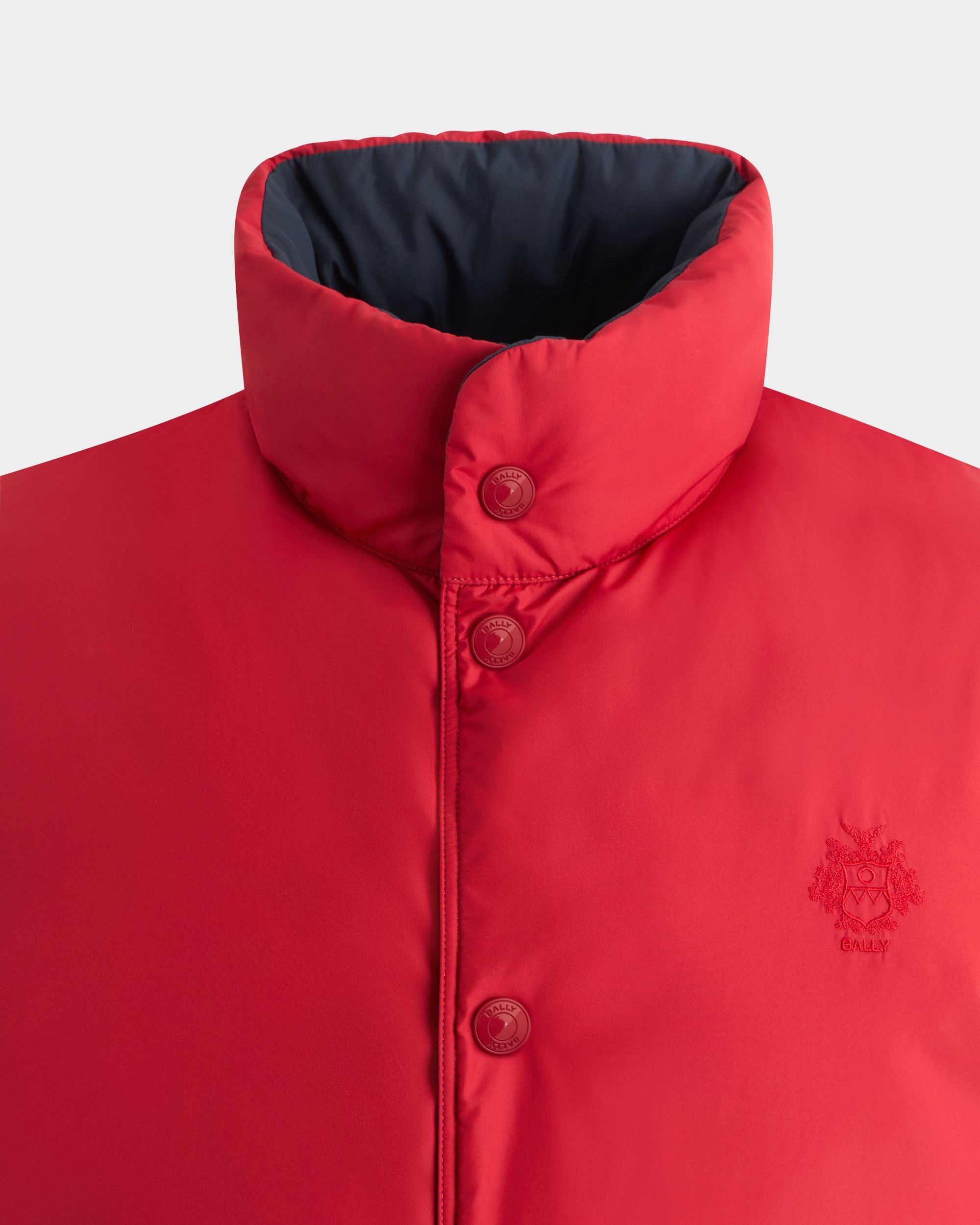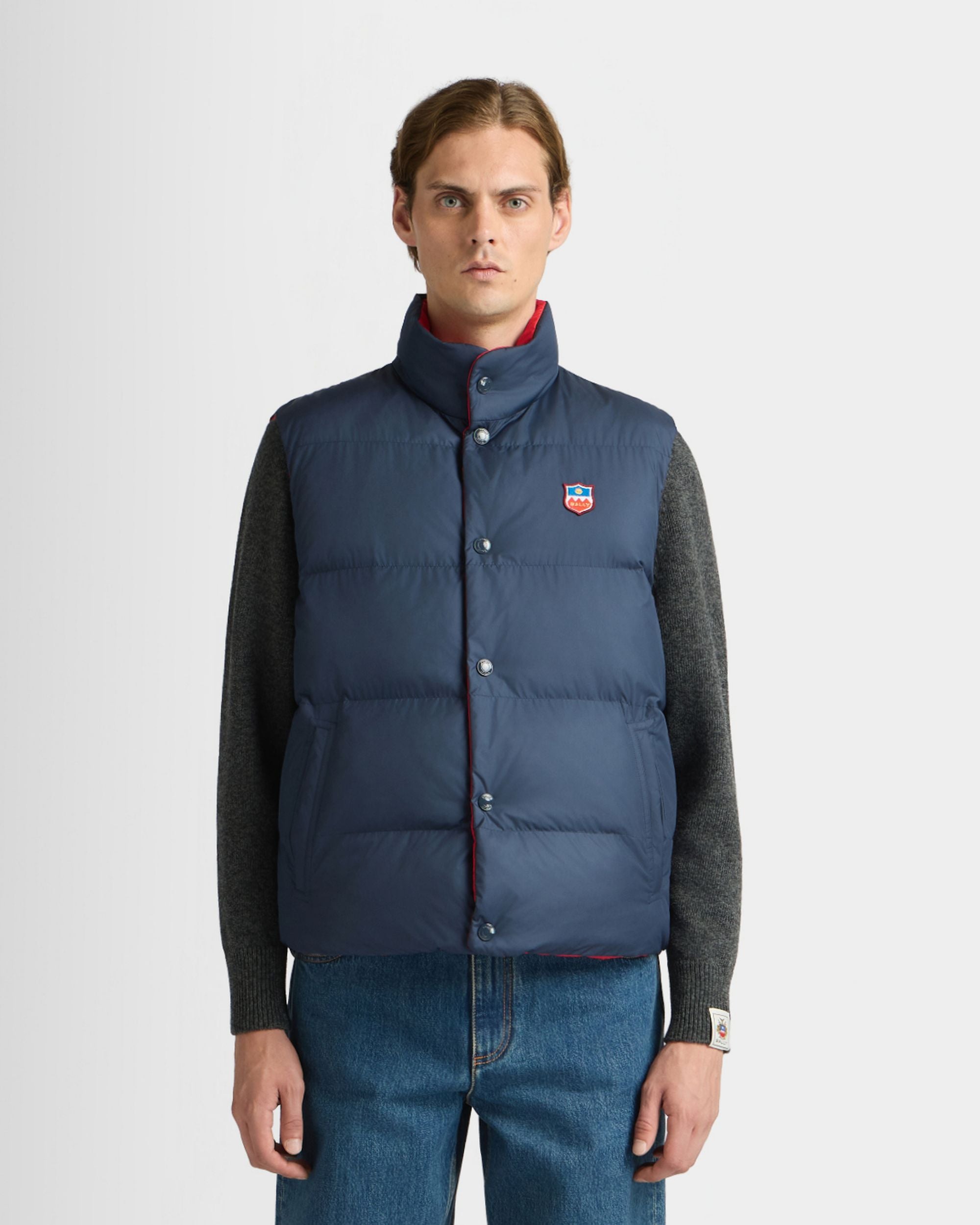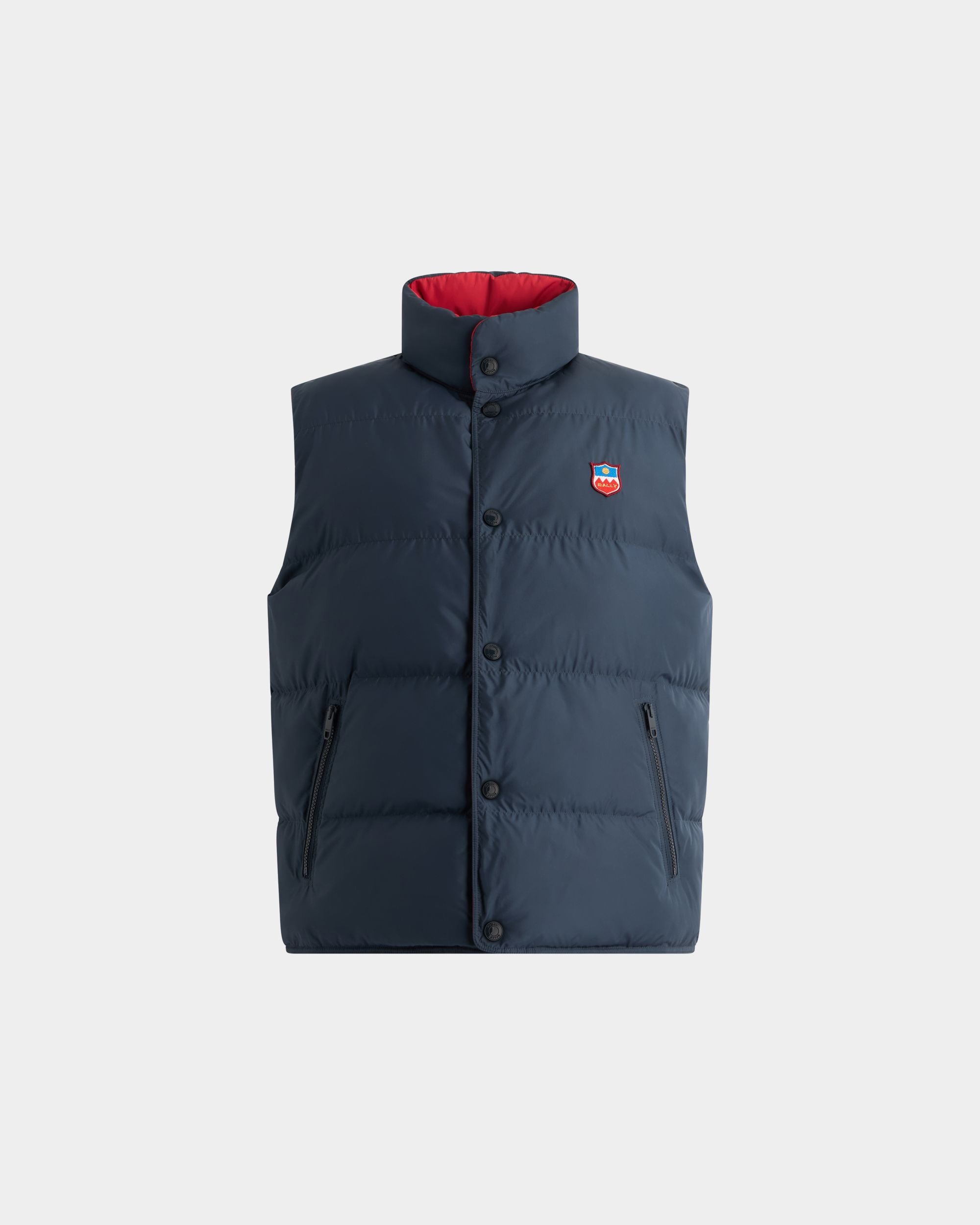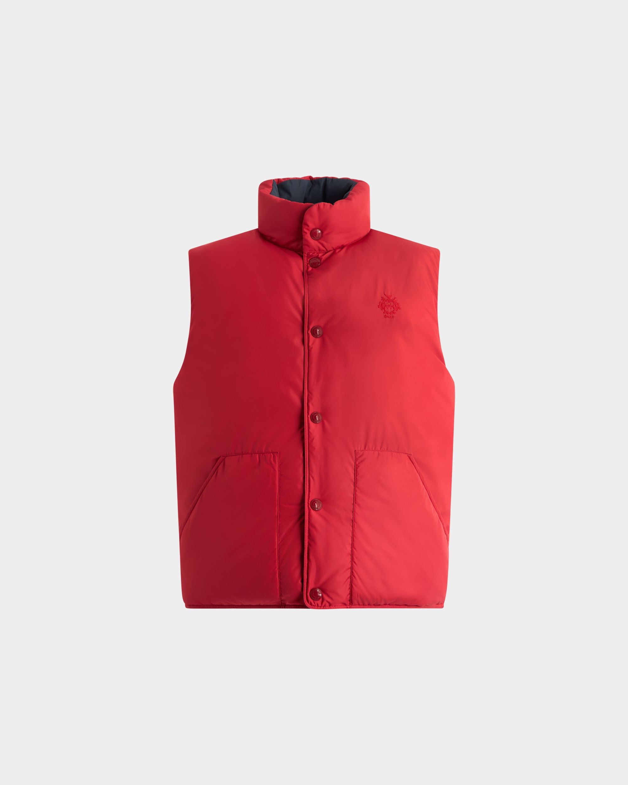 This warm high-collar puffer vest in polyester canvas features a reversible design. An embroidered Crest patch finishes the left chest of the blue side, while a tonal Crest is embroidered on the red side.
