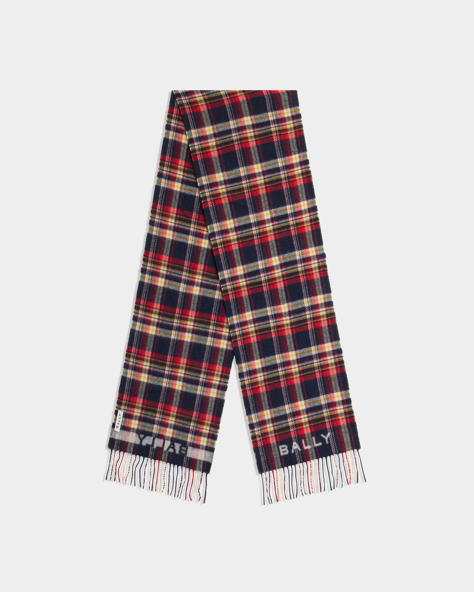This soft wool scarf has a multicolor plaid motif and Jacquard-woven Bally logos atop the twisted fringe on the short edges.