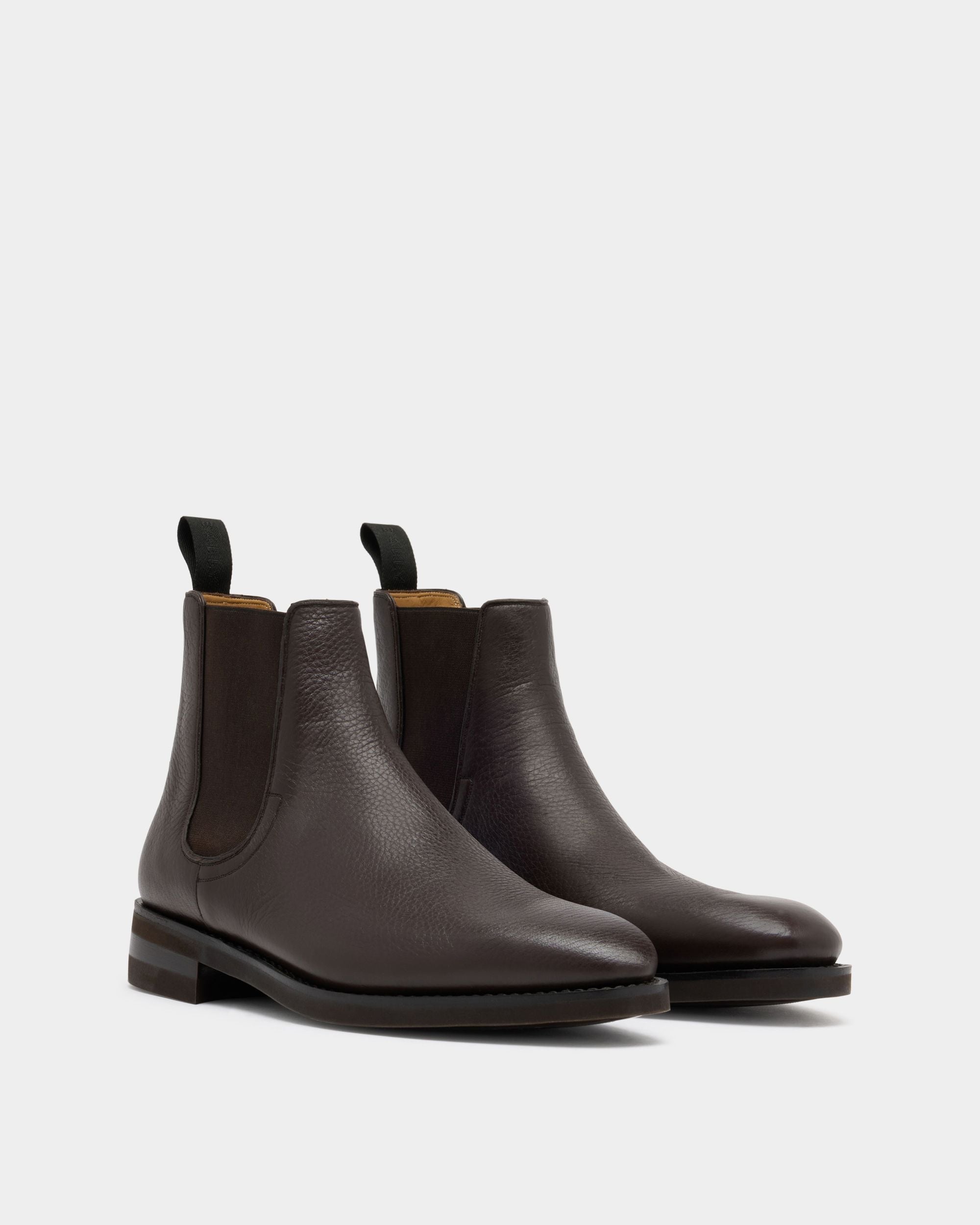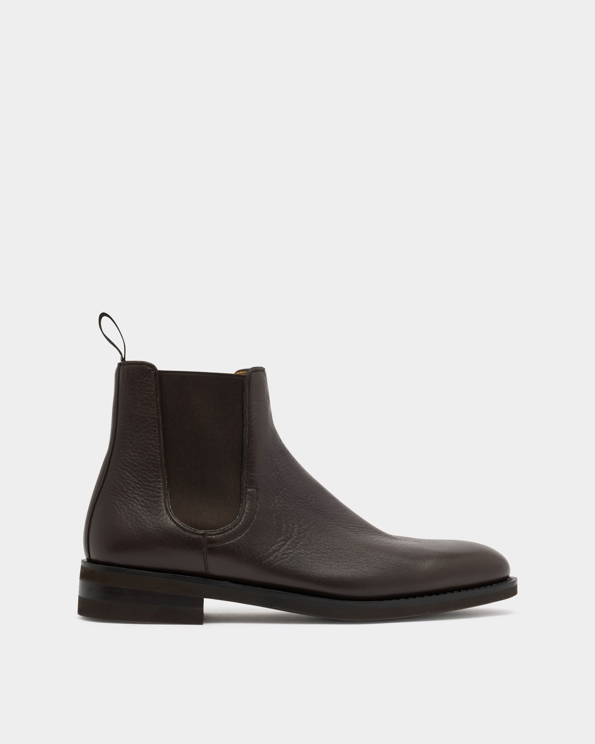 Almond-toe Scribe Un bootie in brown grained buckskin with quintessential elasticated panels and a Bally logo pull tab. Goodyear construction ensures the water resistance of the welted rubber sole on this Chelsea boot.
