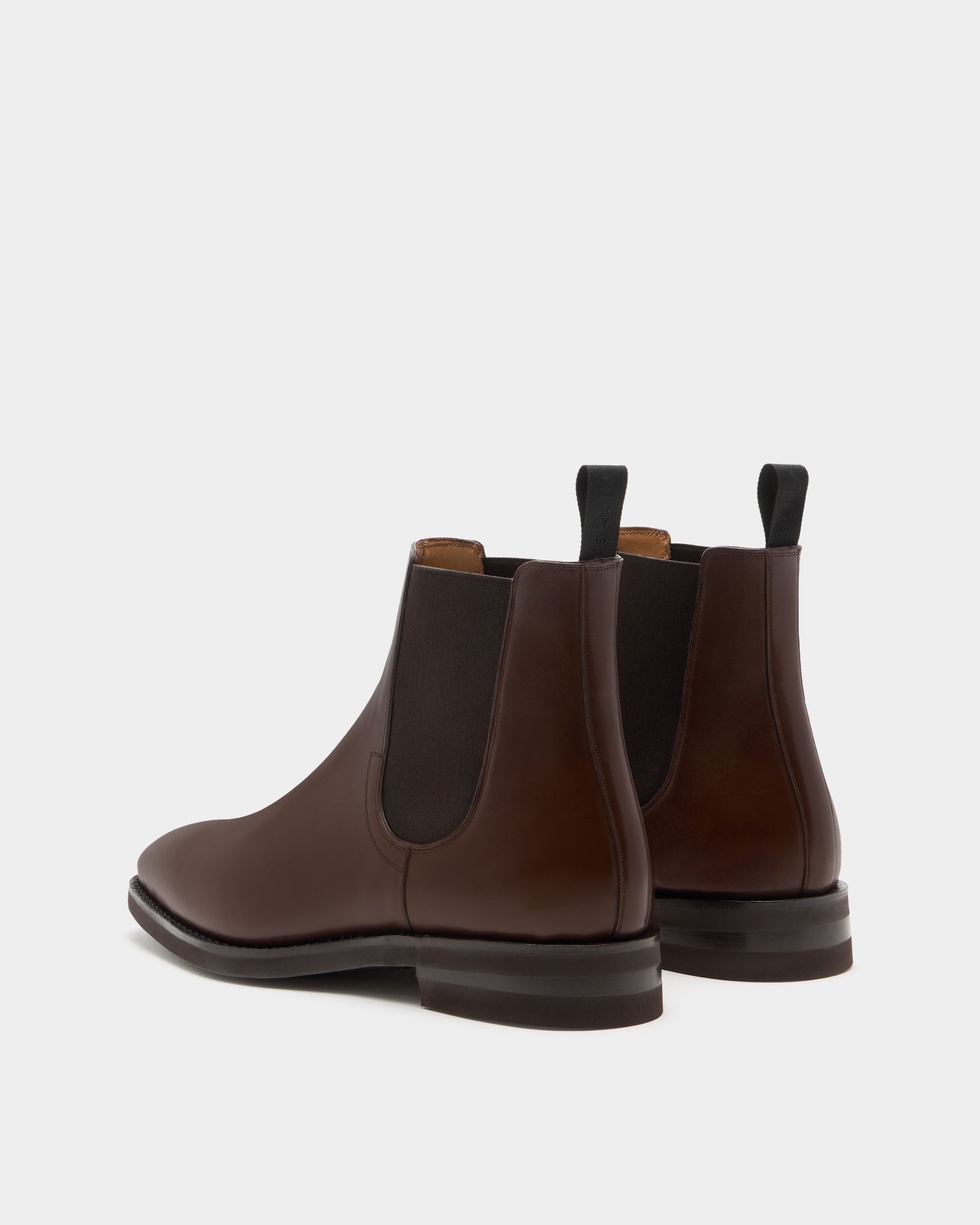 Timeless design defines this almond-toe Scribe Un bootie in brown calfskin. It has been hand polished on the toe cap and heel, the finishing touches of the over 200 steps required for its construction. A jacquard-woven Bally pull tab at the back unites style and function on this essential Chelsea boot.