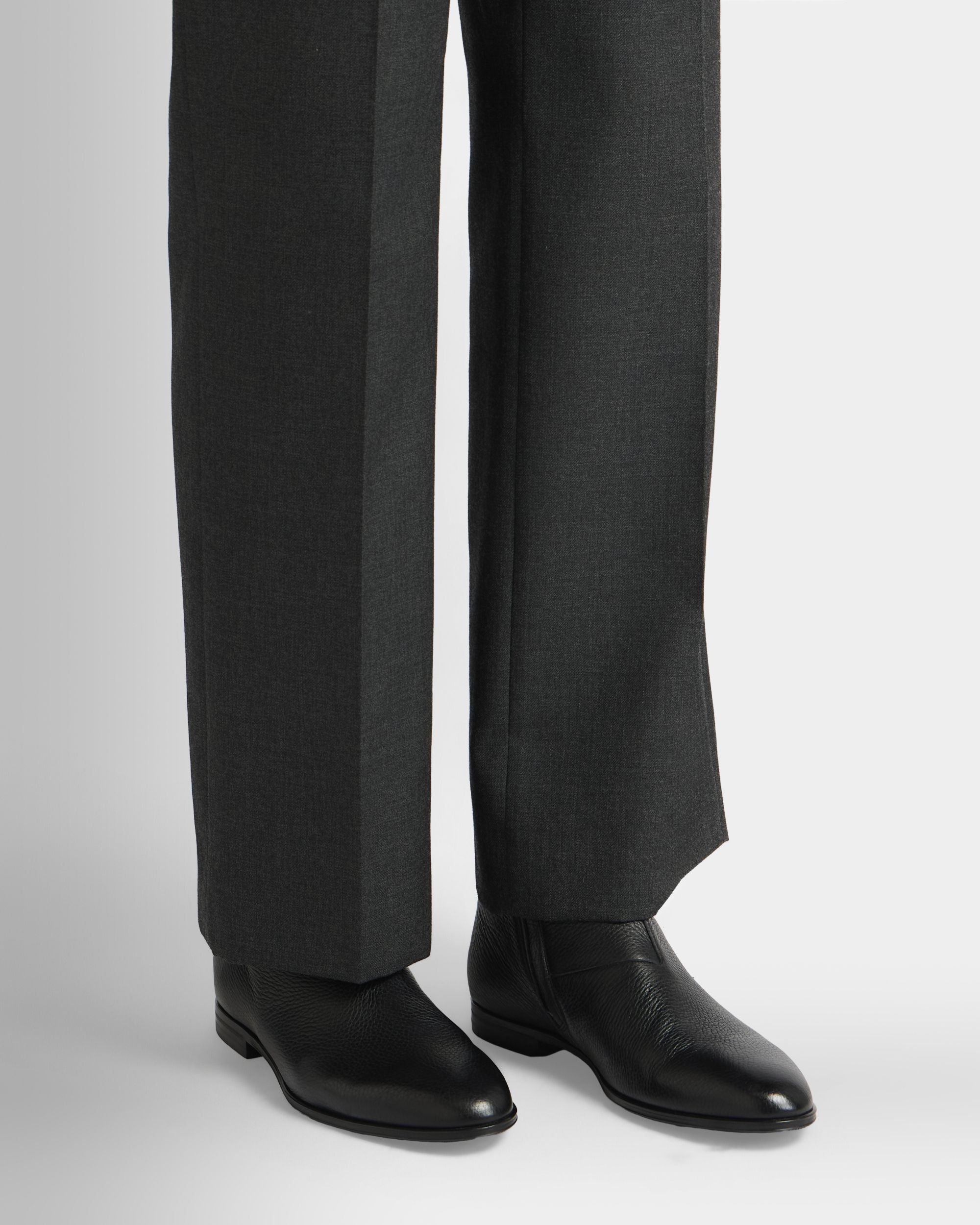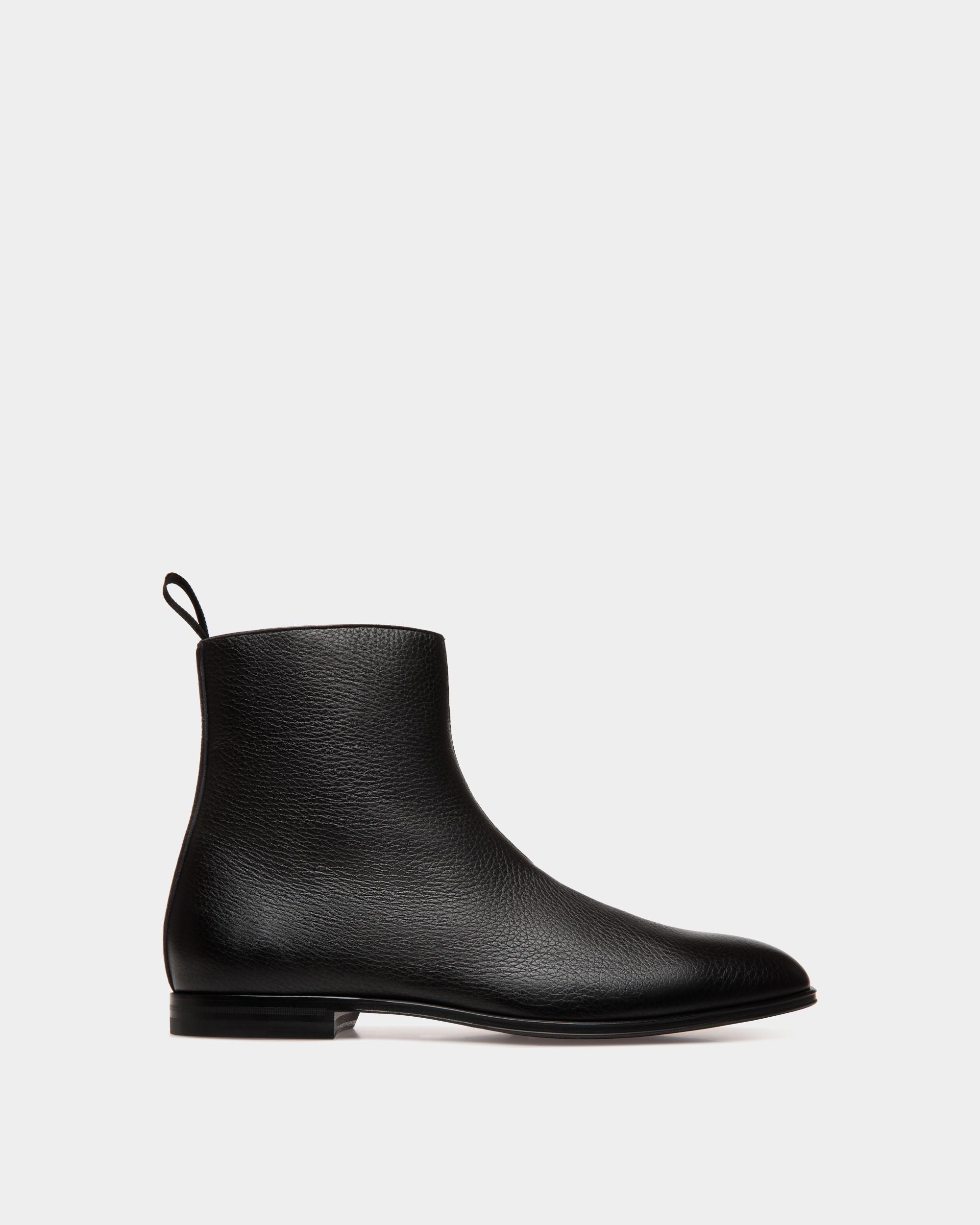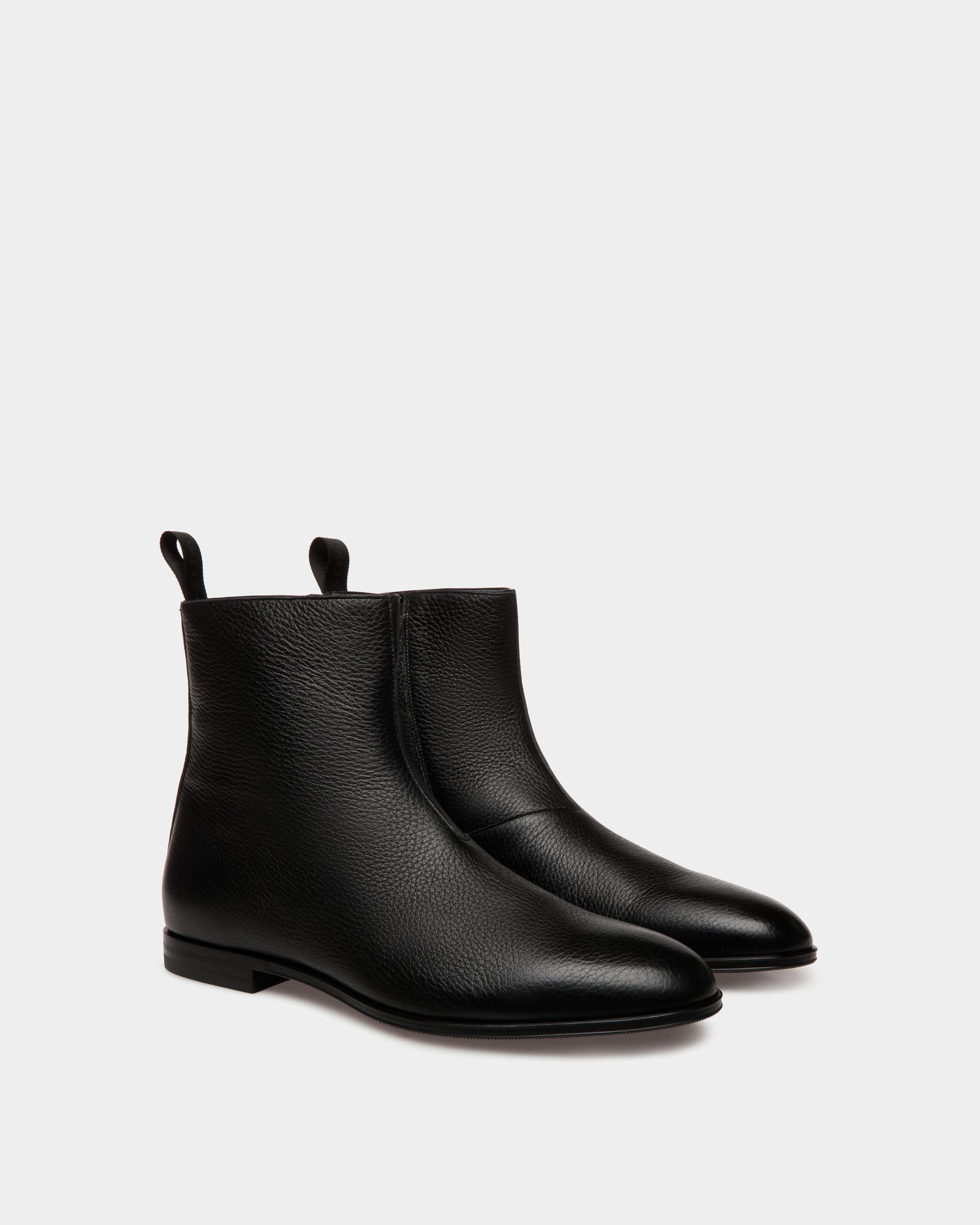 An essential silhouette defines this Westminster boot in black grained deer leather. The upper is sleek, with seams kept to a minimum, and embellished by a simple strip of leather and a pull loop at the back. A zipper is concealed on the inner ankle, for easy slip on and off.